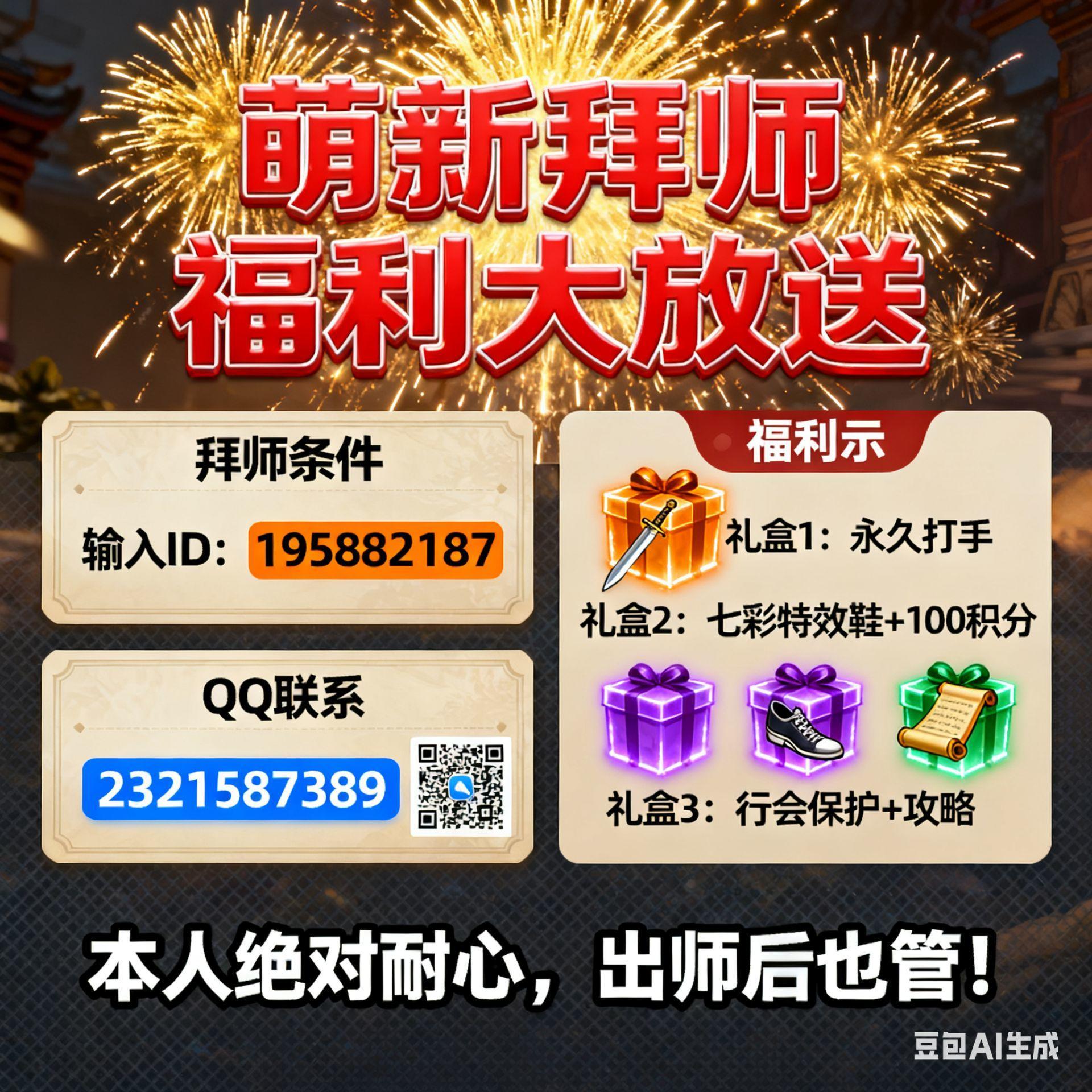 超活跃师傅收徒 拜师在右上角师徒界面输入id195882187你将获得一个长期活跃的打手助力萌新启航 出师以后包萌新进入行会不会在新手期被欺负 如遇到审核中的情况不用担心 在线半小时以后输入礼包码“我要变强”即可获得前期强力装备也可以加QQ2321587389来催促 详细攻略在上面图片