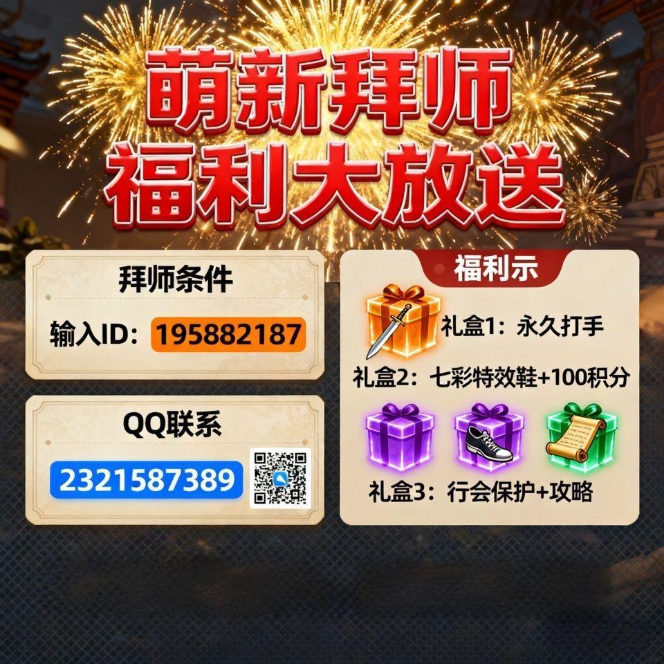 超活跃师傅收徒 拜师在右上角师徒界面输入id195882187你将获得一个长期活跃的打手助力萌新启航 出师以后包萌新进入行会不会在新手期被欺负 如遇到审核中的情况不用担心 在线半小时以后输入礼包码“我要变强”即可获得前期强力装备 详细攻略在上面图片
