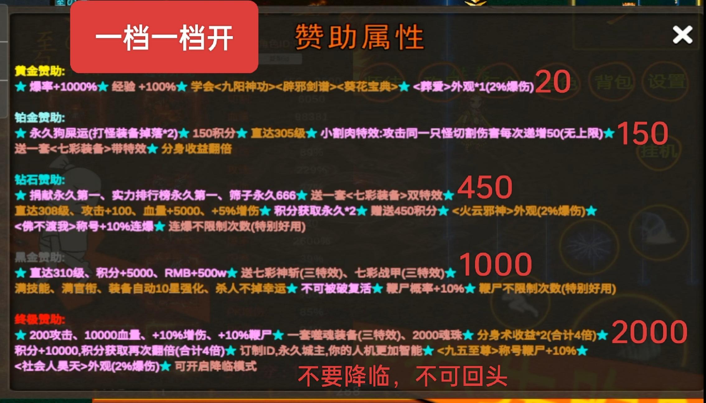 新人攻略: 1.礼包码:我要变强(须在线30分钟领)————————— 2.可以联系客服领取七彩(远攻)武器一把 。出师给(地钉)鞋子。这俩优先强化十星。十星不掉落。————————— 3.拜师: 就是(召唤神兽)技能。土城比基尼雕像设置。无限制召唤。出师奖励积分(可兑换黄金赞助)。还有(群攻鞋子)。很强大。越早拜师越好,百利无一害。————————— 4.幸运:武器超级祝福油+8.