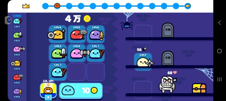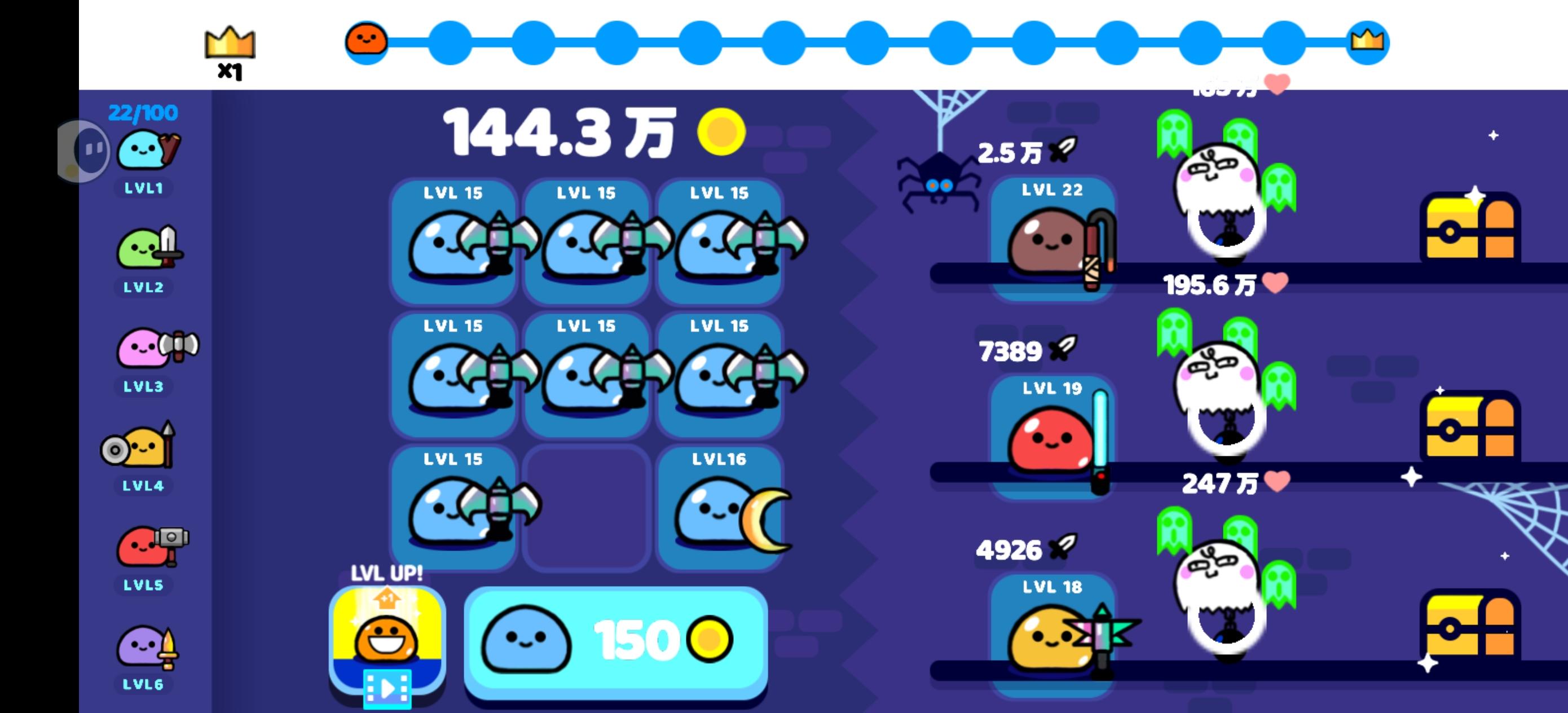 养成主要针对史莱姆等级,二合一操作很枯燥,若不想从1级开始合成,就需要看广告提升史莱姆最低等级,合成会变得轻松不少。最终目标是所有关卡通关,可以看到王冠的位置,不提升最低等级的话,是个很漫长的过程。