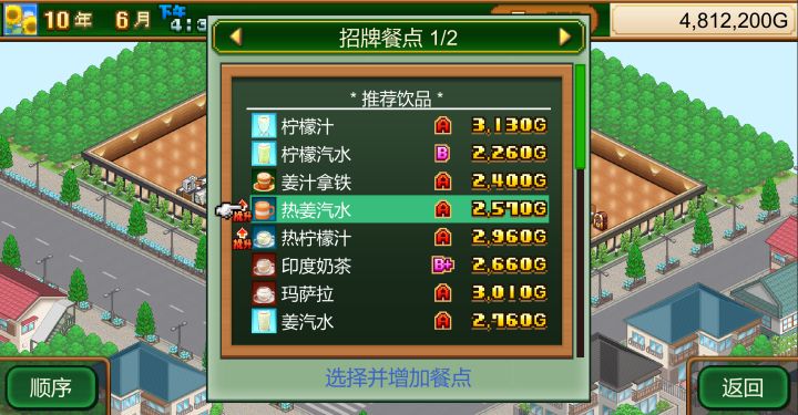 我在游戏里最喜欢做的就是研究开发新的饮品配方。我一直以来都特别的偏爱与饮料调制相关的游戏,把不同的材料混合在一起,调制出一款独特的饮料。游戏中有足足63种饮品,在类别上可以分为6类。这里吐槽一下“茶”和“冰茶”不知道为什么要翻译成“红茶”和“冰红茶”。提到冰红茶的话,脑子里先出现的不是茶的种类而是饮料品牌啊。我是对照着维基页面进行调配的,把自己已经掌握的饮品配方打勾去掉,这样子操作起来方便很多,也不会浪费材料。研究出一样的饮品后,多出来的饮品会在名字的后面加上数字后缀。比如像是“柠檬汽水2”。旧的饮品想删除,但是也不知道怎么删除,有点难受。在“菜单”和“更新饮品”里很占位置。有时候会有饮品种类热潮,比如说像“热饮热潮”这样。在热潮期间,此种饮品会格外受欢迎。这种时候可以更新调整一下招牌菜单。不过在玩的时候热潮次数多了,我也有些懒得调整了。