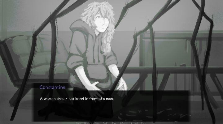 游戏开场讲的童话故事就暗示了会出现的角色。人类是雕塑家前同学Gene。蜘蛛是鳏夫房东Constantine。灯笼鱼是在水中于世隔离没有玩伴的Ivan。蜘蛛和灯笼鱼都是非人类。白毛主角Stasya的性格可能算是相对软弱一点,她常常感到紧张并道歉。有时她会饿肚子不吃饭,经常看到幻觉甚至晕倒,身体也不太好。