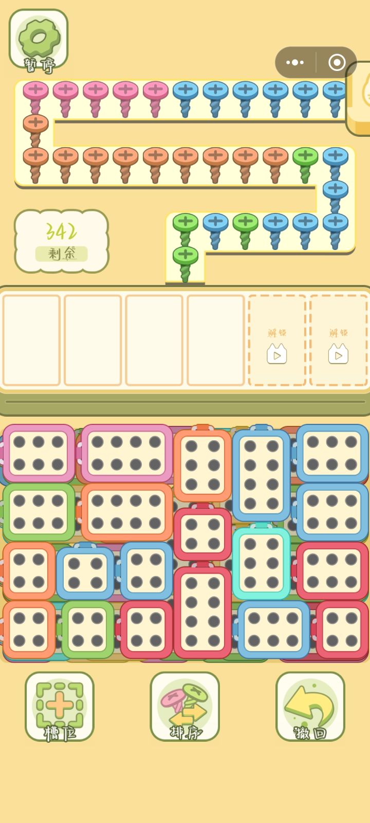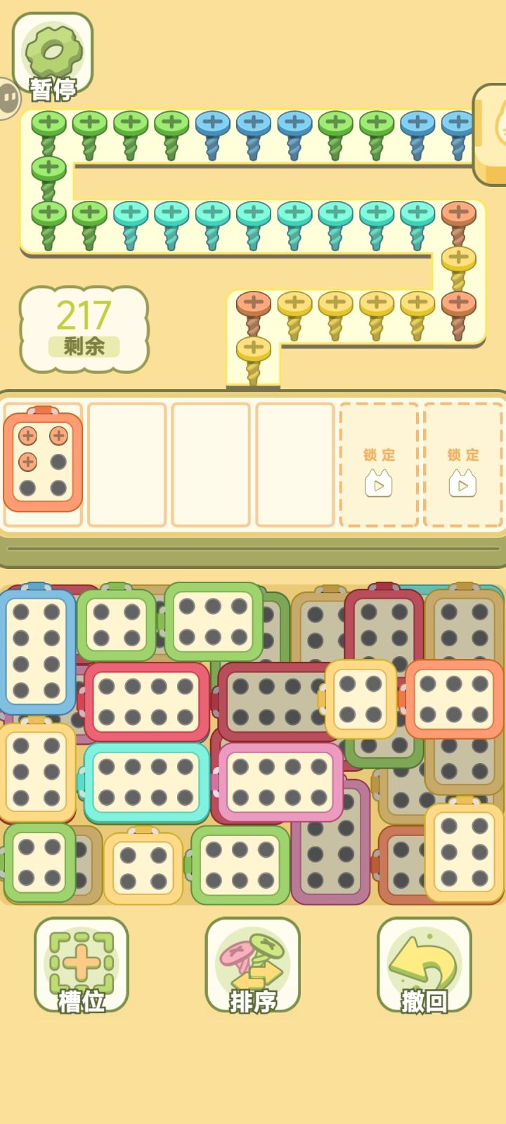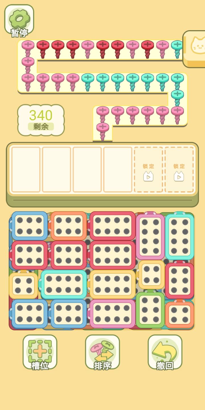 关卡内游戏是拔螺丝,有各种颜色螺丝,以祖玛的形式出现,下方一堆螺丝盒子,有点像汽车拉乘客的画面表现。根据螺丝颜色选择盒子,没做引导基本也能明白规则,上手不难。