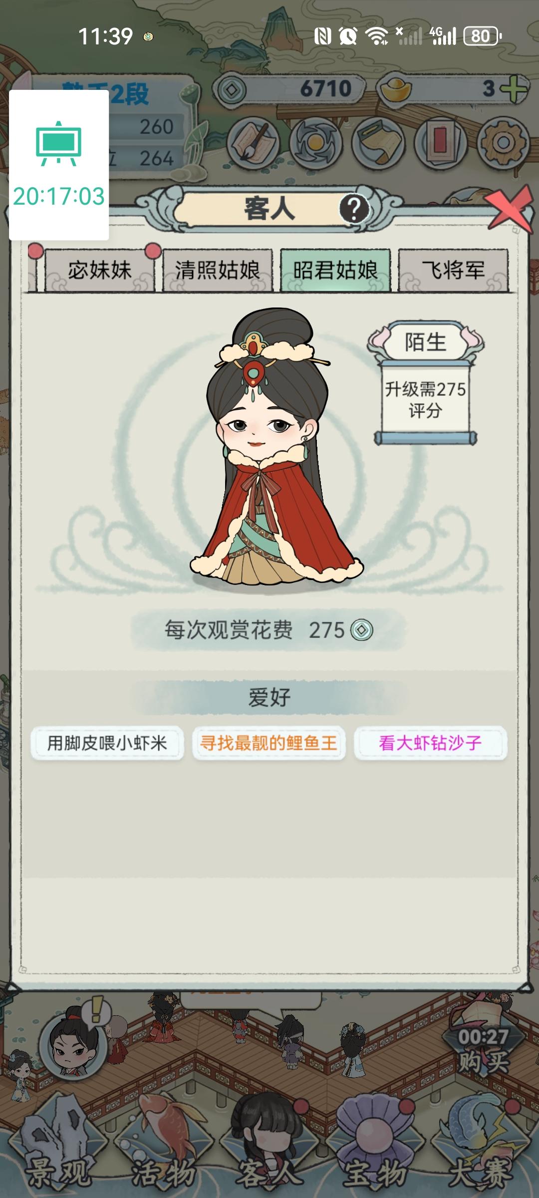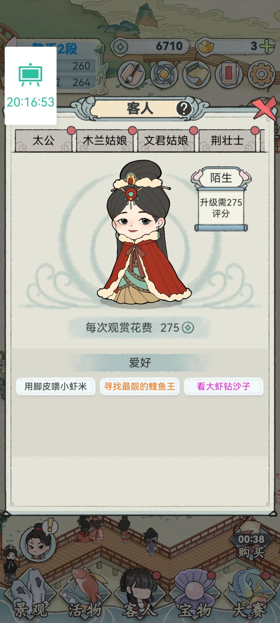 休闲挂机游戏,画面音乐都可以,池子里鱼互相吞噬的设定也很有意思,就是有个地方不理解。客人里面同样是将军张飞就直接被叫将军,木兰和钟无艳称呼就变成了姑娘,同样是义士荆轲就是壮士到西施又是姑娘🤔既然做了历史人物进来就没必要男角色称职务,女角色称性别吧