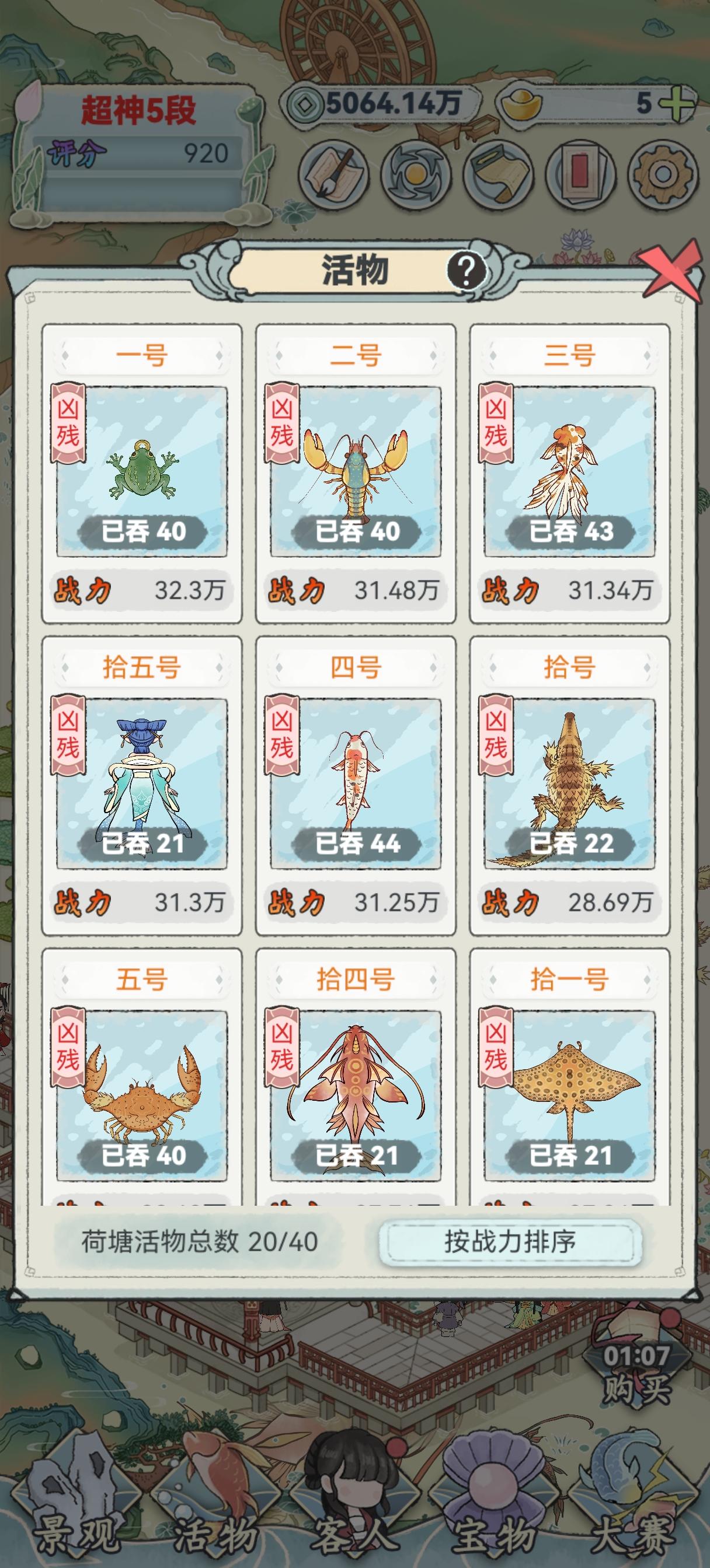 开局压级,避免钟爱的小垃圾战力不够被吃了。先用更垃圾提升小垃圾的战力,然后锁四个,加上小垃圾一共保留五个。锁上的鱼只有微小几率吃别的,不锁吃到剩五个也会自动不吃了。然后就可以操作了,高战力的直接踢飞,低战力的留着让小垃圾吃。我选择了金鱼乐趣有了,时间也浪费了更多,主要是浪费前期压级提升小垃圾,和体型小吃的慢上。同时间里大体型吃的更多,可能是狩猎范围比较大吧。重