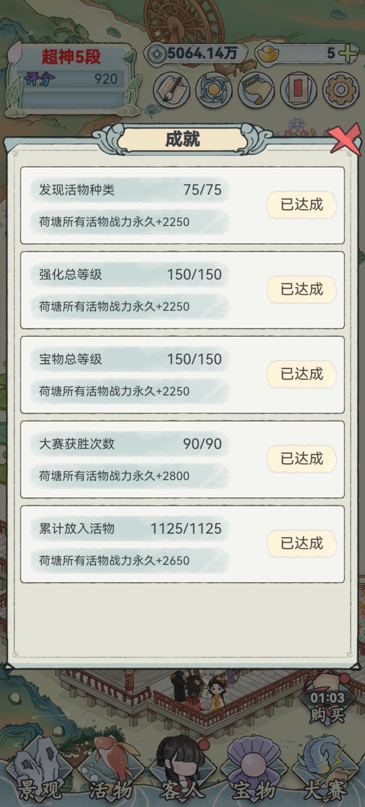 🚩游戏类型:养成、模拟经营、模拟、休闲🌋游戏特点:1.建造荷塘景观,扩大荷塘内可容纳的活物数量,给活物提供良好的生存环境。2.购买活物,对活物进行饲养,提高活物的战斗力。3.强化活物,强化不同种类活物总体的战斗力。4.参与大赛,挑选战力最强的活物参与大赛,打败对手,成为荷塘之王。5.收集宝物,参与大赛胜利获得宝物,收藏宝物,为活物提高战力。6.吸引顾客前来,了解顾客喜好,根据顾客喜好