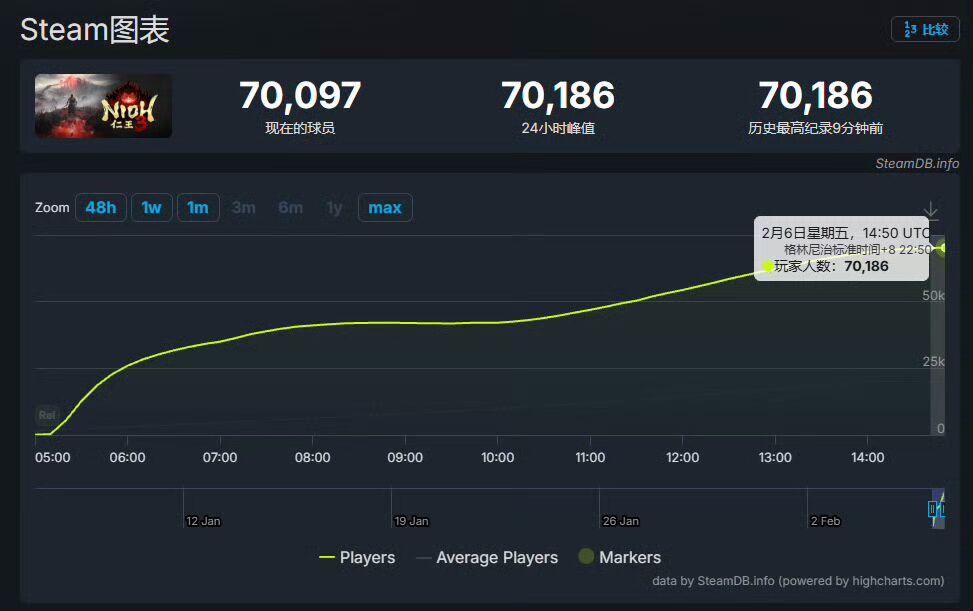 今天,光荣特库摩旗下忍者组开发的《仁王3》正式发售,SteamDB统计显示游戏同时在线峰值达70186人,口碑较首发阶段明显回升。该在线峰值数据由SteamDB统计,《仁王3》70186人的峰值,超过《仁王2》41325人与《仁王》10649人的峰值总和,刷新系列历史纪录。游戏目前的Steam好评率为75%,评价状态为多半好评,相比发售初期的褒贬不一状态有显著回升。《仁王3》同步登陆Steam与