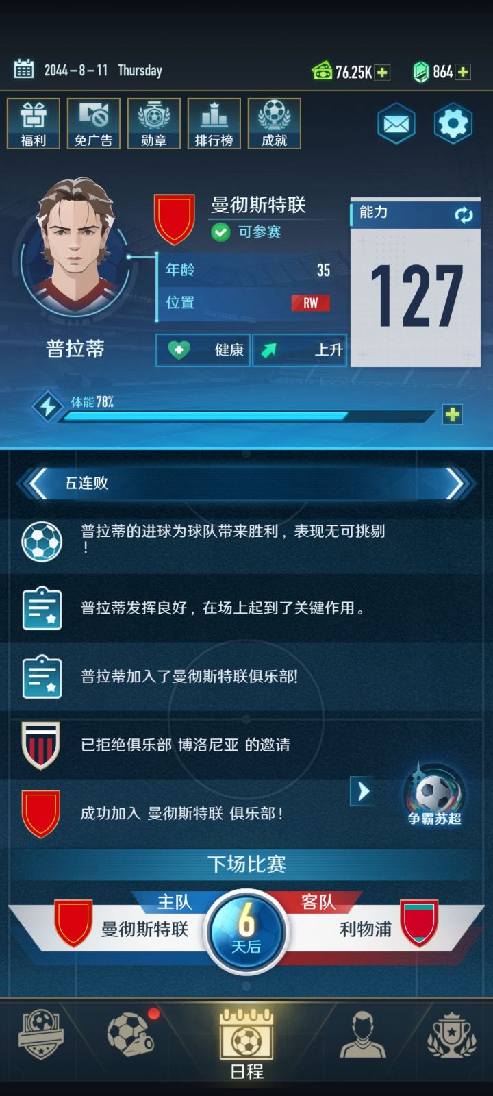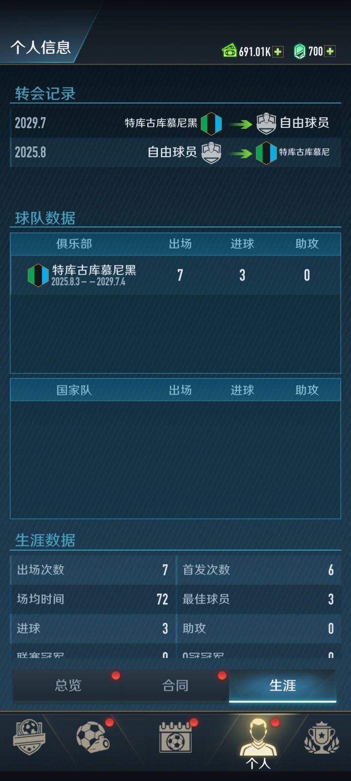 速刷天赋的档,除了开头几局一次都没踢也没上场,全靠国家队自己努力送了我个足球先生和金球奖
