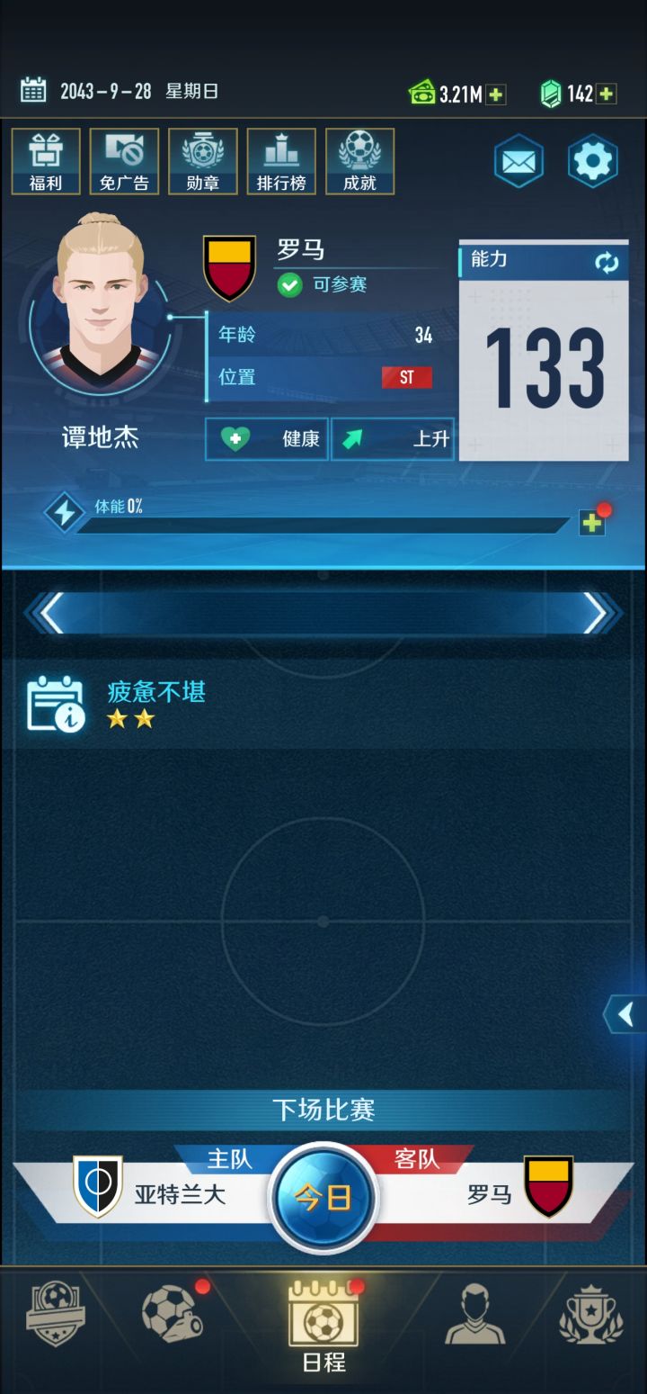 排行榜第一镇楼。世界杯6连冠,欧洲杯7连冠,41岁1000球。下面说点给新人的经验。1.前几个档,尽可能耗空体力快速跳过,36岁退役必随机解锁三个天赋。最起码要有天才少年+大器晚成,才能上1402.天赋推荐,加实力最重要天才少年+大器晚成,提升20%左右训练速度,25岁花100钻更换,必带覆盖全场,加自身实力,代价只是比赛多花2点体力,必带团队至上,提升球队实力,根据状态提高球队500