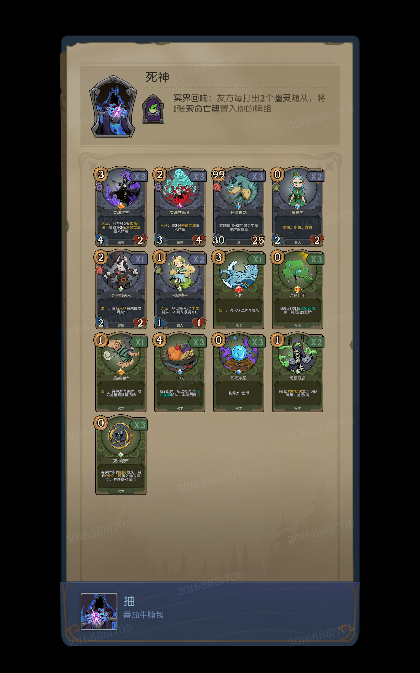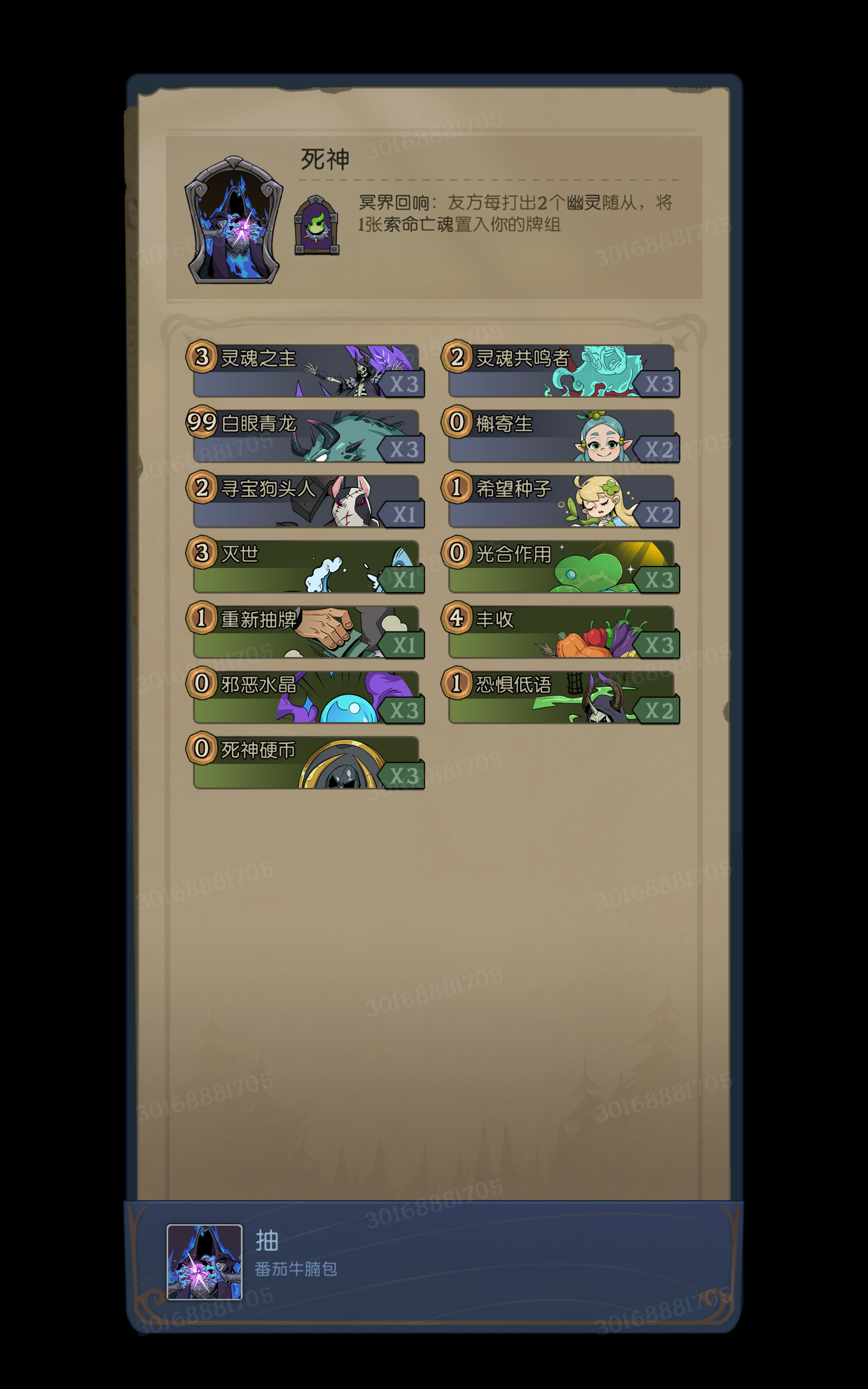 兄弟们,娱乐就行,磕磕巴巴otk#死神##随从-灵魂之主x3#随从-灵魂共鸣者x3#随从-白眼青龙x3#随从-寻宝狗头人x1#随从-希望种子x2#随从-槲寄生x2#咒术-光合作用x3#咒术-丰收x3#咒术-恐惧低语x2#咒术-死神硬币x3#咒术-灭世x1#咒术-邪恶水晶x3#咒术-重新抽牌x1#O6F0MTnhXqbapqGeFmI4iDKFBOepyDuxfYZ