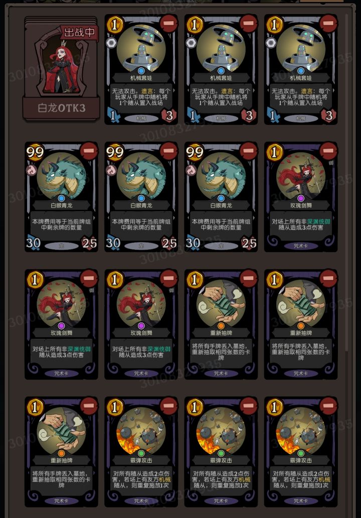 每当我在天梯掏出这套卡组是,我的脑子里总会浮现出那句经典的台词“我受够繁文缛节了!”,这套卡的强度就是这么逆天。核心组件自然是套娃+白眼青龙的组合,依靠AOE伤害击杀套娃拉出自己的白眼青龙以完成OTK。由于白眼青龙只有30攻,且剑舞无法伤害深渊统御系列的随从,就导致这套卡在面对皇后卡组时显得尤为吃力,因此不建议在皇后卡组多的环境里使用。这套牌的摇摆卡位不算多,主要是在与封印、陷阱拆解和苦守的取