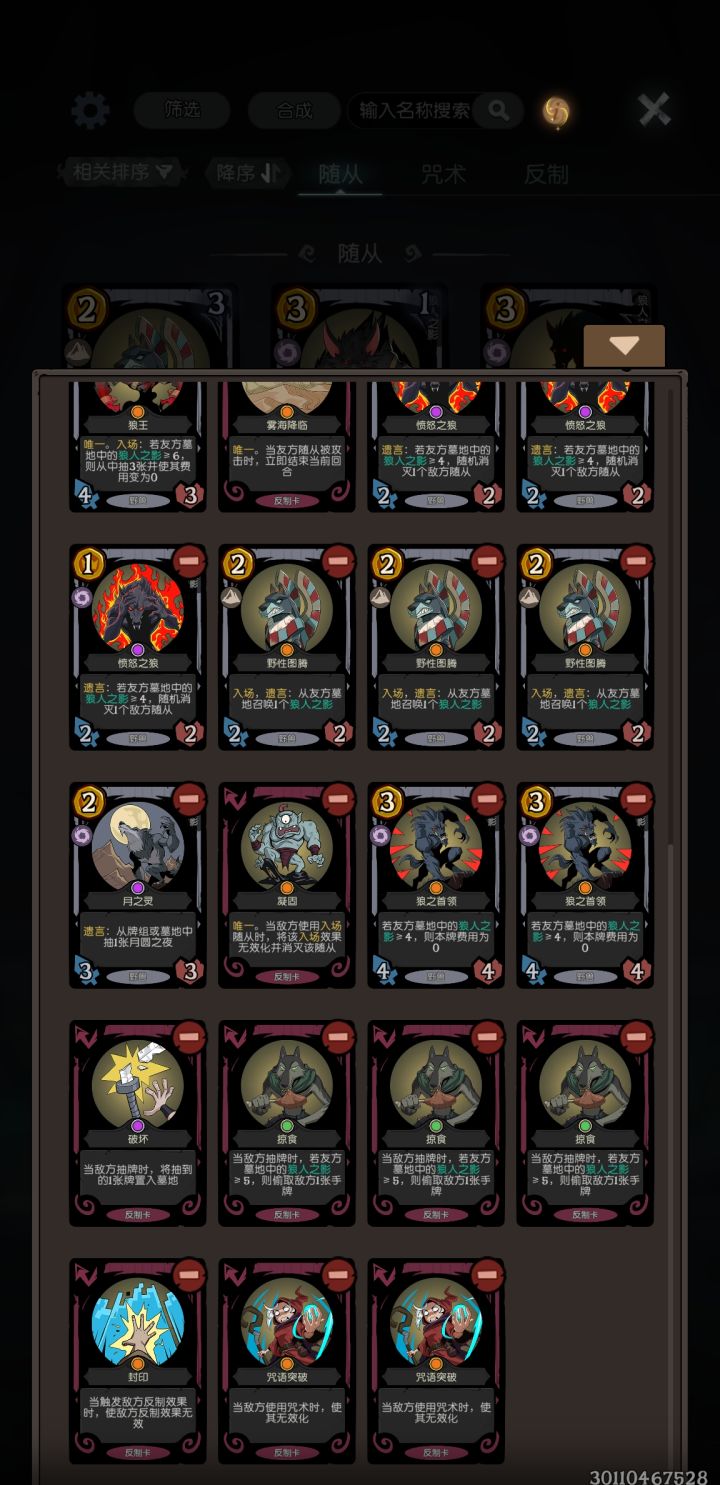 这是一套比较稳定的狼人流派,经过在传说段位打了几天还有和多个群友相互切磋,整体感觉下来还是强度和稳定都有保证。整体思路就是前期放狼群和咆哮者堆墓,然后野性图腾反复拉牌拖到中期,最后放出终端月圆之夜。期间可以放出掠食,中断,凝固,咒术突破不断打断对方节奏。前期留狼群和咆哮者,如果有复数的这两个可以把狼王留下来。掠食,咒术突破等感觉差不多再放,免得放太久被别人给吃了。咒术突破本来是为了防自闭卡组