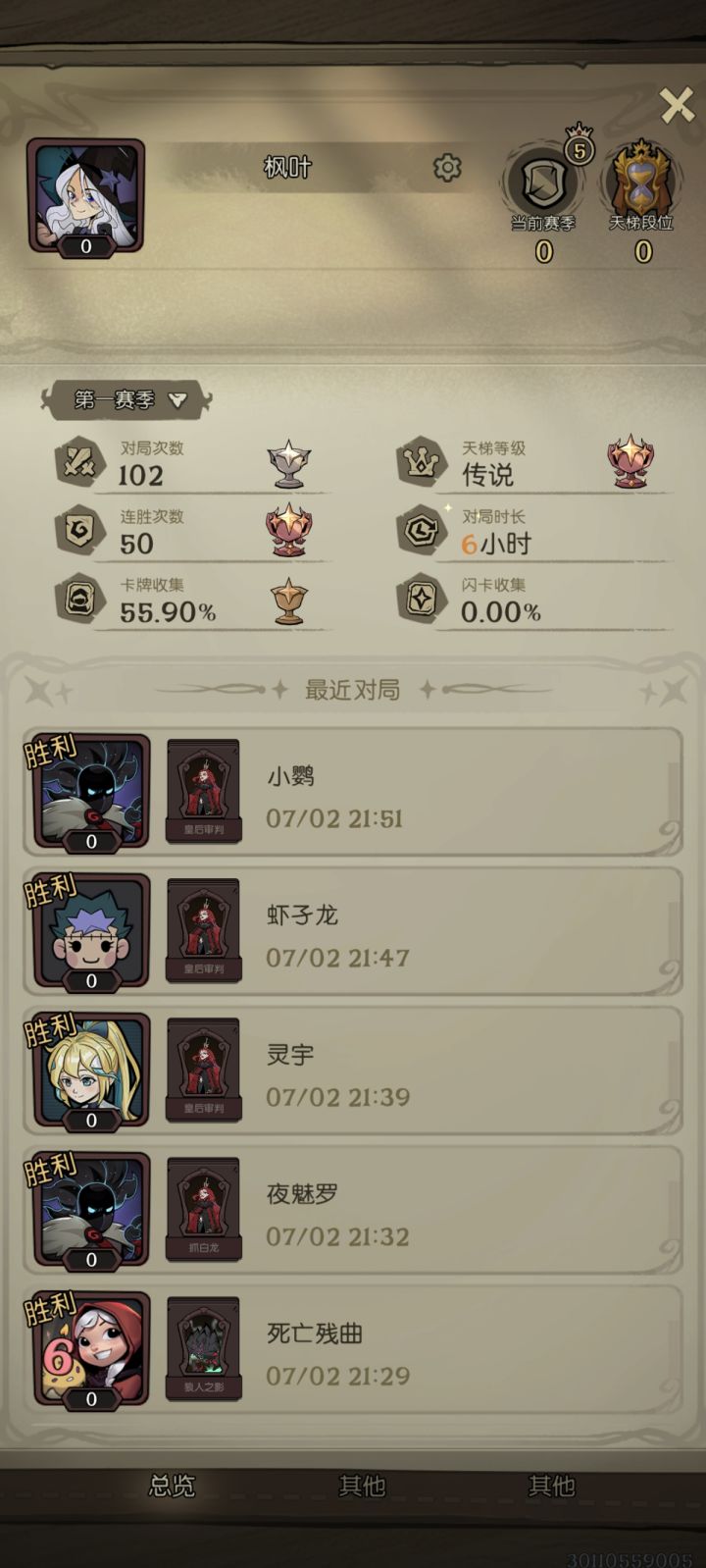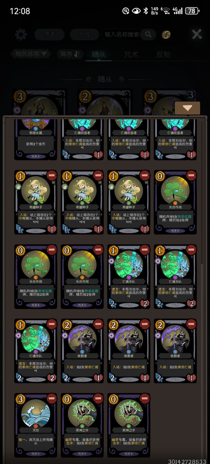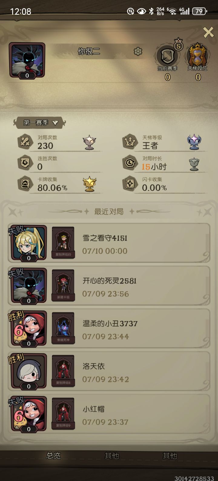 这套卡组的原理主要是通过极致的过牌,让幽灵快速的增加伤害和出伤,达成OTK的卡组。一开始的手牌最好要有个增伤,不然会拖很久有可能翻车,如果没有增伤的话,最好能有个幽灵之主,加快一下过牌。也是打到了王者,后面有兴趣再打了。如果是打自闭体系,就尽量削减他的血线,然后手里面存一个灭世去清场,不让他去卡格子。对上其他的流派,基本上过得够快就能赢。