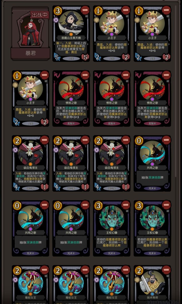 今天刚下游戏,前面一直在摸索暴君这么玩,后面发现二十费的那张暴君简直是陷阱,换成女皇靠觉醒带的暴君才是正解,然后一路四十三连胜打上传说,在传说打到五十连胜发现完全不加分就来写攻略了首先玩这套卡组一定要对血线敏感,理想情况是回合内自身16-20血,然后拍下剑术导师扣五血觉醒,然后用黑天鹅激活暴君,将对方踹死。那么如果在对方回合被打进十五血,暴君出现,然后对方用卡解掉了怎么办?不用慌,一张王权幻象暴
