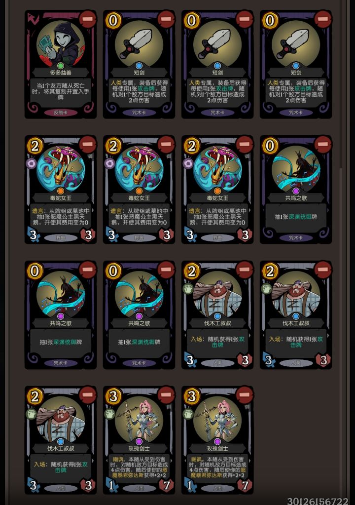 新版本之后,设计师大幅加强了人类卡组,短剑和掌灯的效果直接翻倍,那么毫无疑问地,现在天梯就成了人类帽的新王朝。思路分析:这套牌的主要启动点有三个,分别是短剑、掌灯人和玫瑰三种。由于三者均需要大量的攻击牌作为启动资源,因此这套携带了外婆+多多益善的高效刷攻击牌的组合。除了启动组件,蛇+黑天鹅的优质过渡体系、玫瑰公爵的减费也为整套卡组润滑了不少,实战期间这套卡很难卡手。这套牌由于不害怕雾海以外的