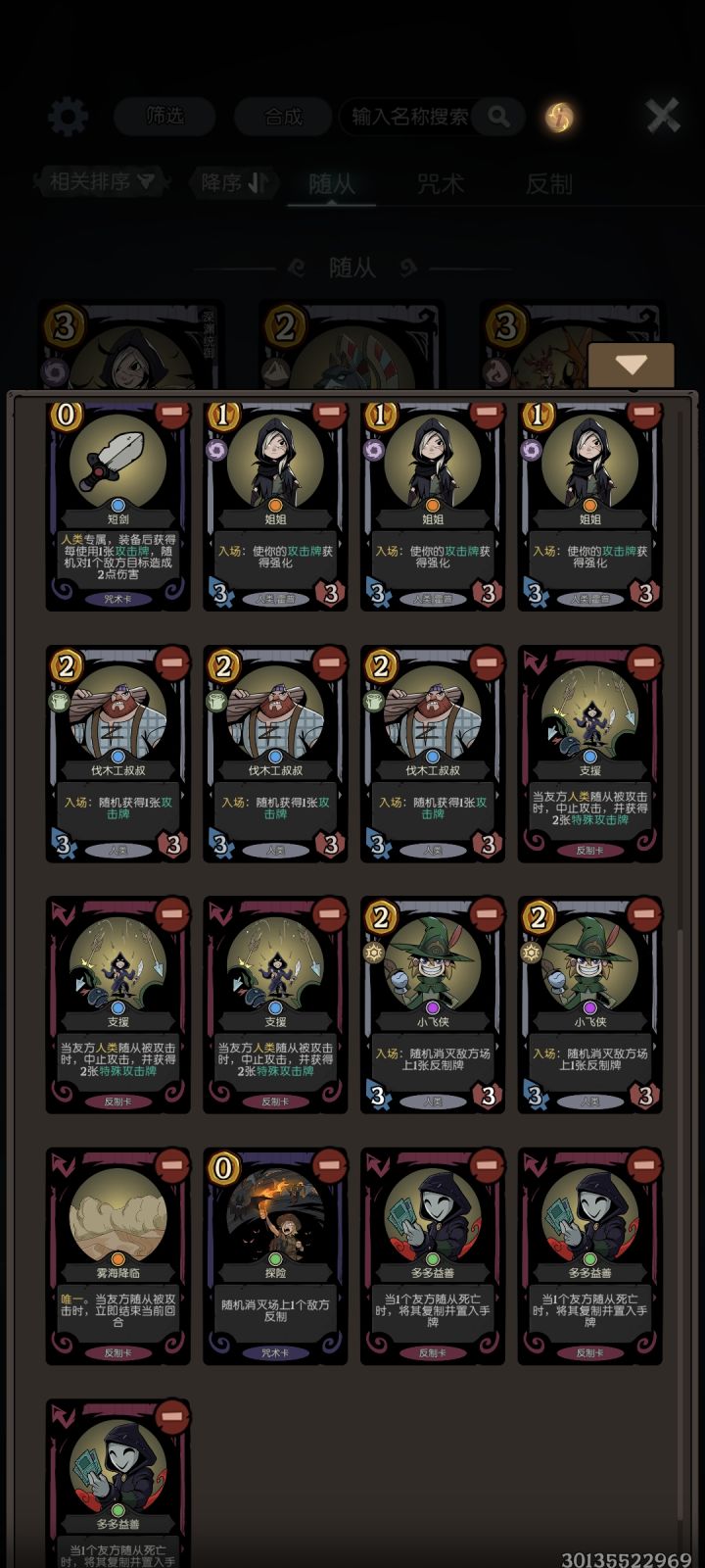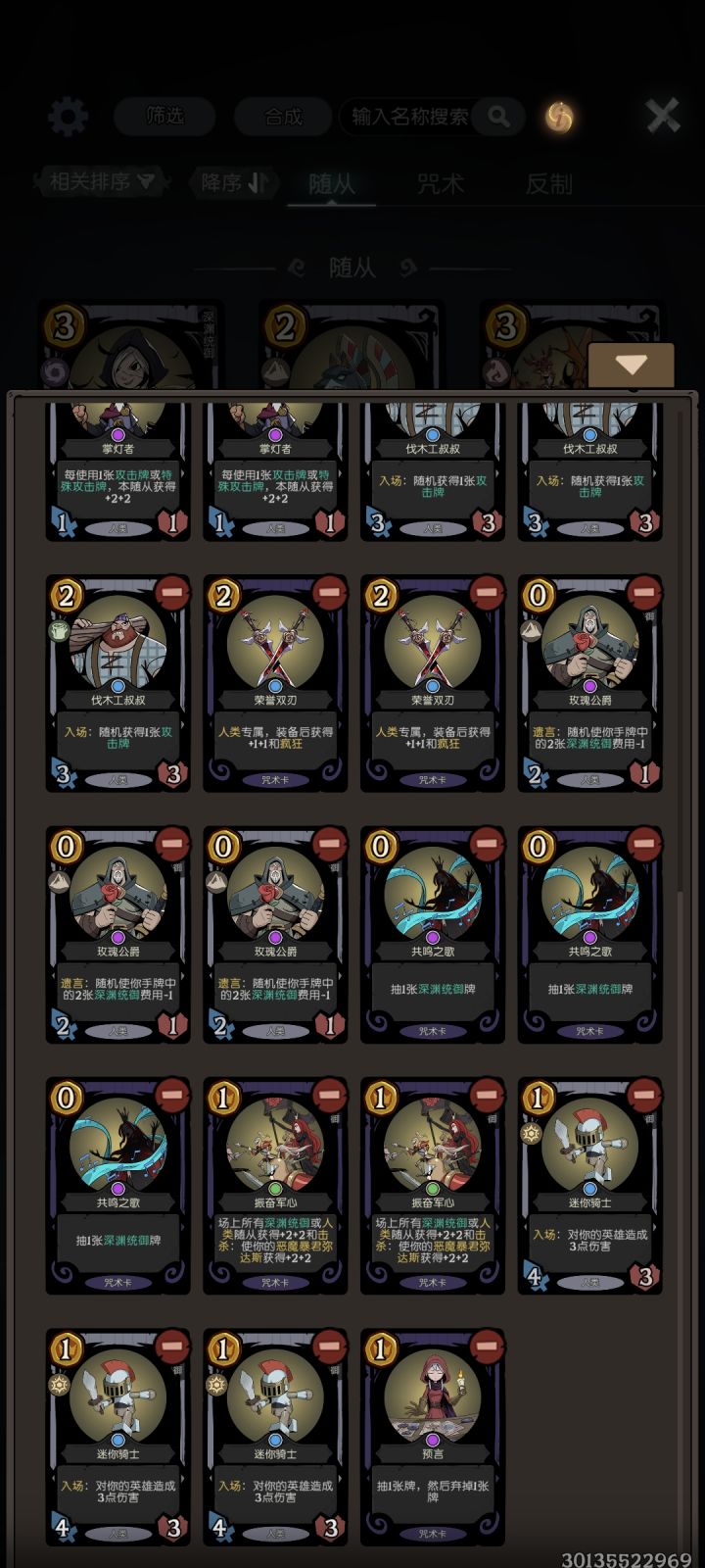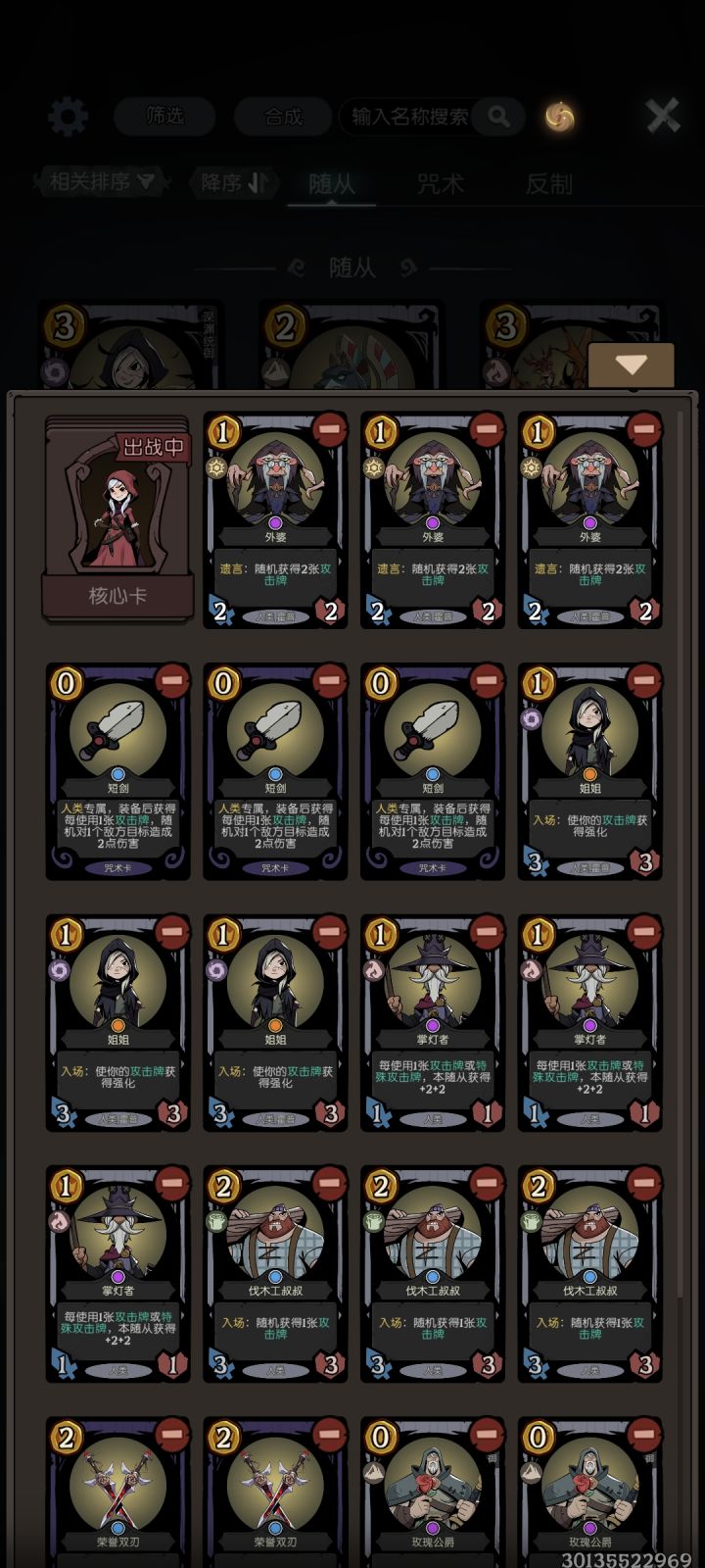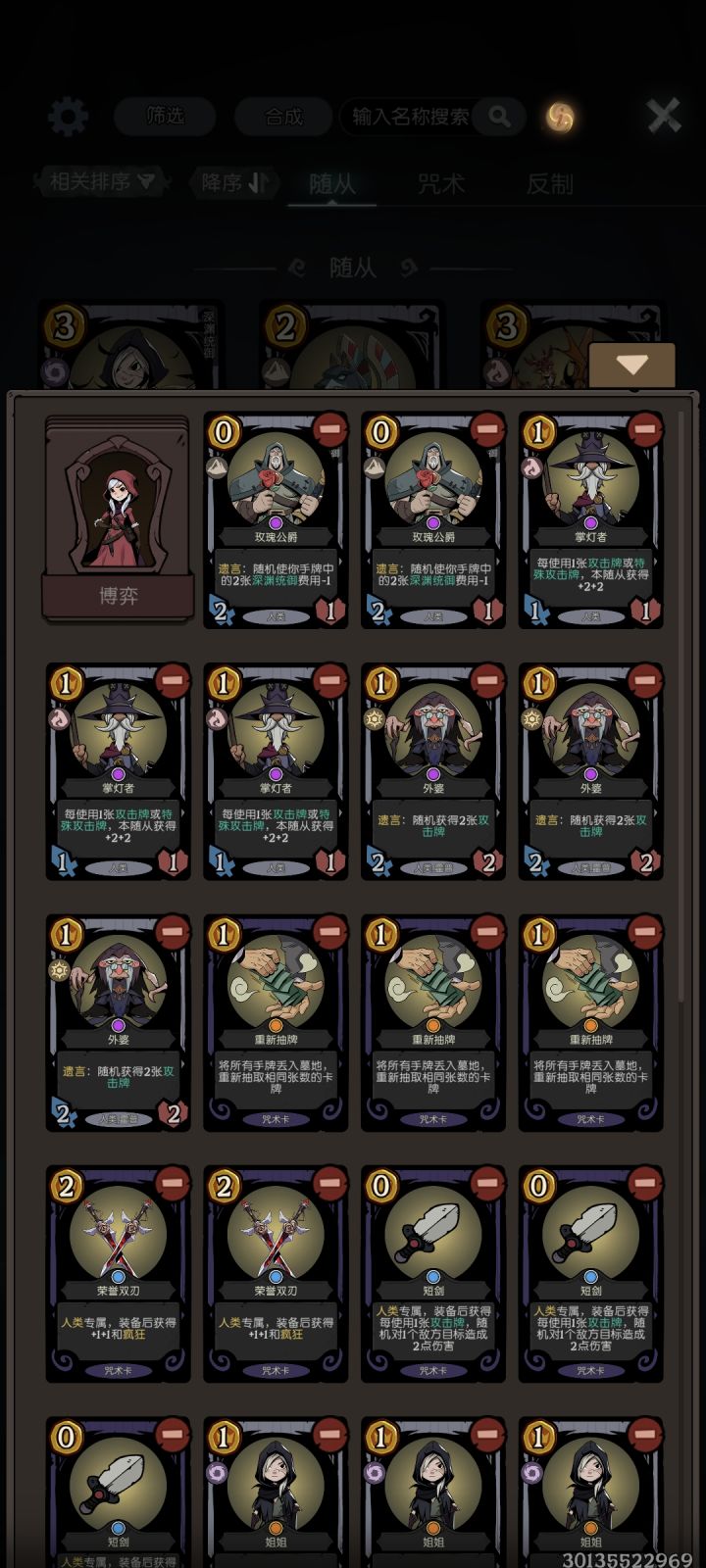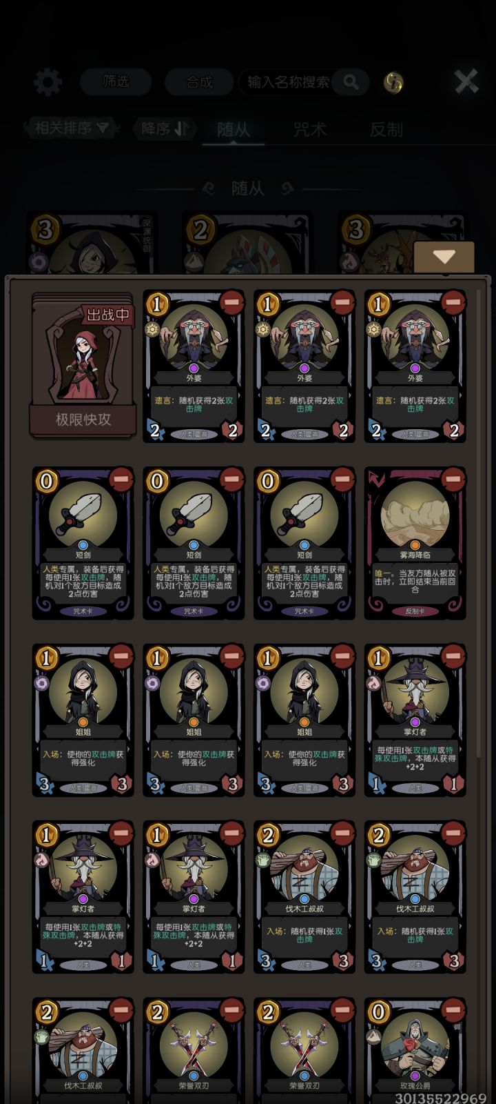 新版本之后,设计师大幅加强了人类卡组,短剑和掌灯的效果直接翻倍,那么毫无疑问地,现在天梯就成了人类帽的新王朝。思路分析:这套牌的主要启动点有三个,分别是短剑、掌灯人和玫瑰三种。由于三者均需要大量的攻击牌作为启动资源,因此这套携带了外婆+多多益善的高效刷攻击牌的组合。除了启动组件,蛇+黑天鹅的优质过渡体系、玫瑰公爵的减费也为整套卡组润滑了不少,实战期间这套卡很难卡手。这套牌由于不害怕雾海以外的