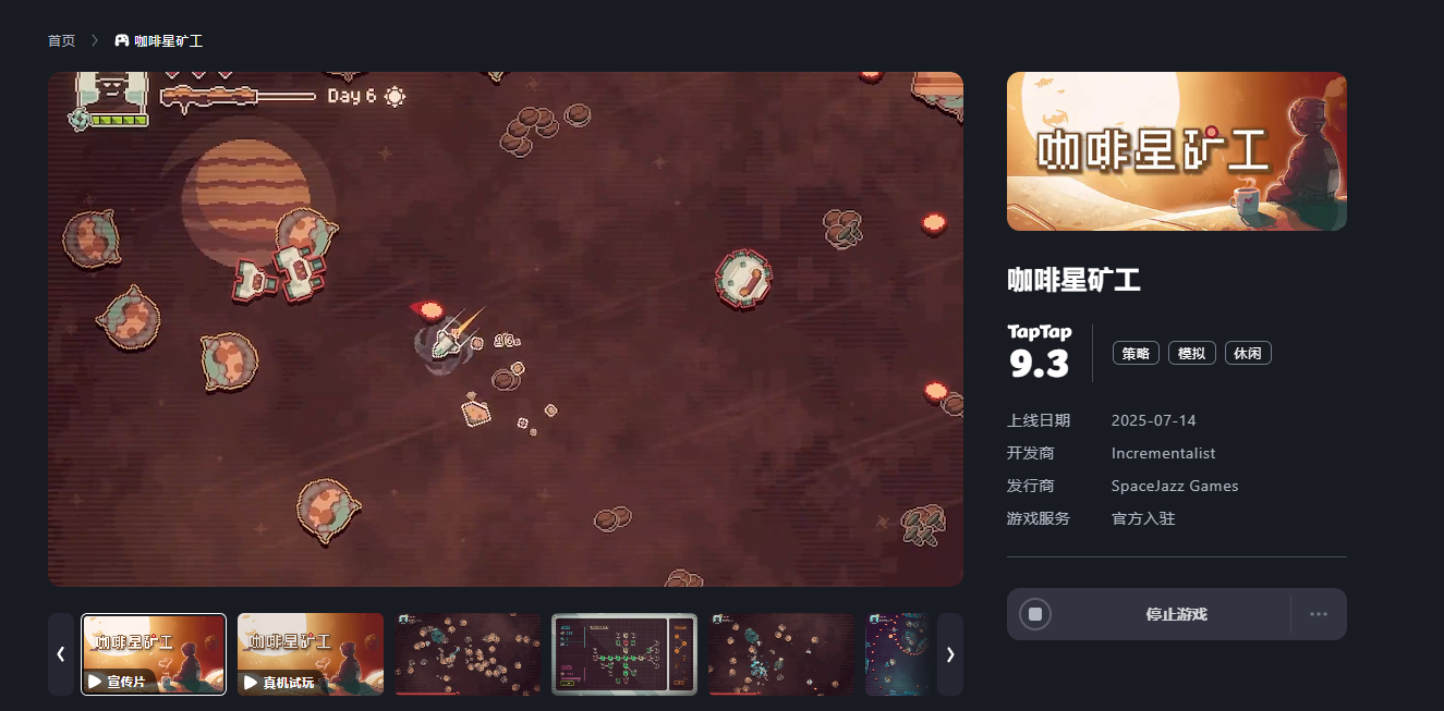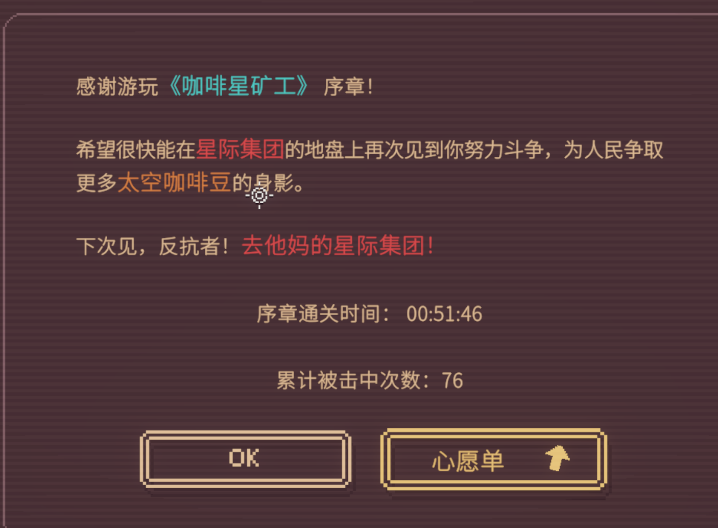 《咖啡星矿工》是一款带有局外养成的即开即玩死了马上下一把极具爽感的弹幕射击游戏,游戏中的主色调为咖啡色的像素风,整体画风偏卡通,配合舒缓的慢节奏轻音乐带给玩家轻松的氛围,体验不错。游戏中玩家只需要操控鼠标控制你的小飞机,小飞机会自动发射激光、炸弹等武器,玩家需要躲避四处游荡的星体躲避敌人的弹幕攻击,击败来犯的飞船以及最后的boss通过关卡。