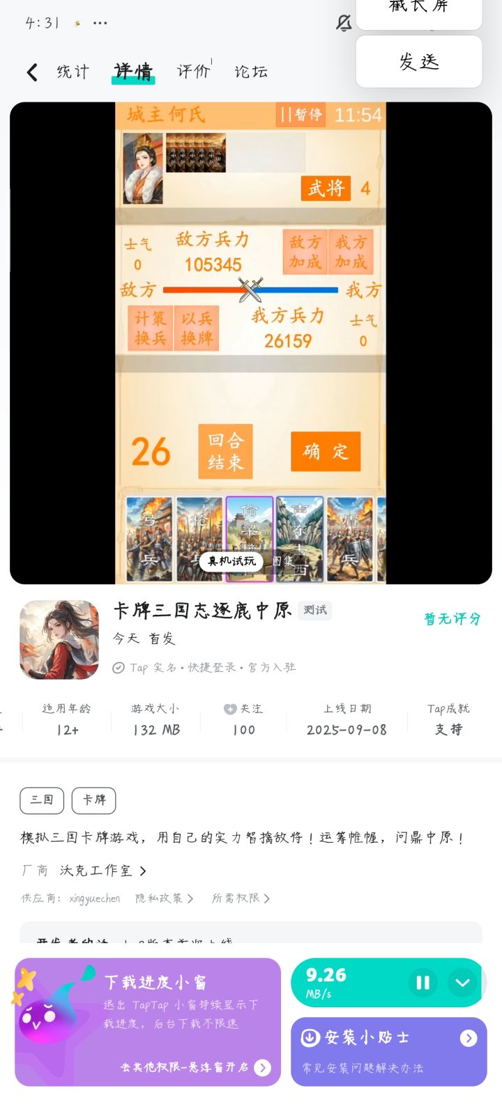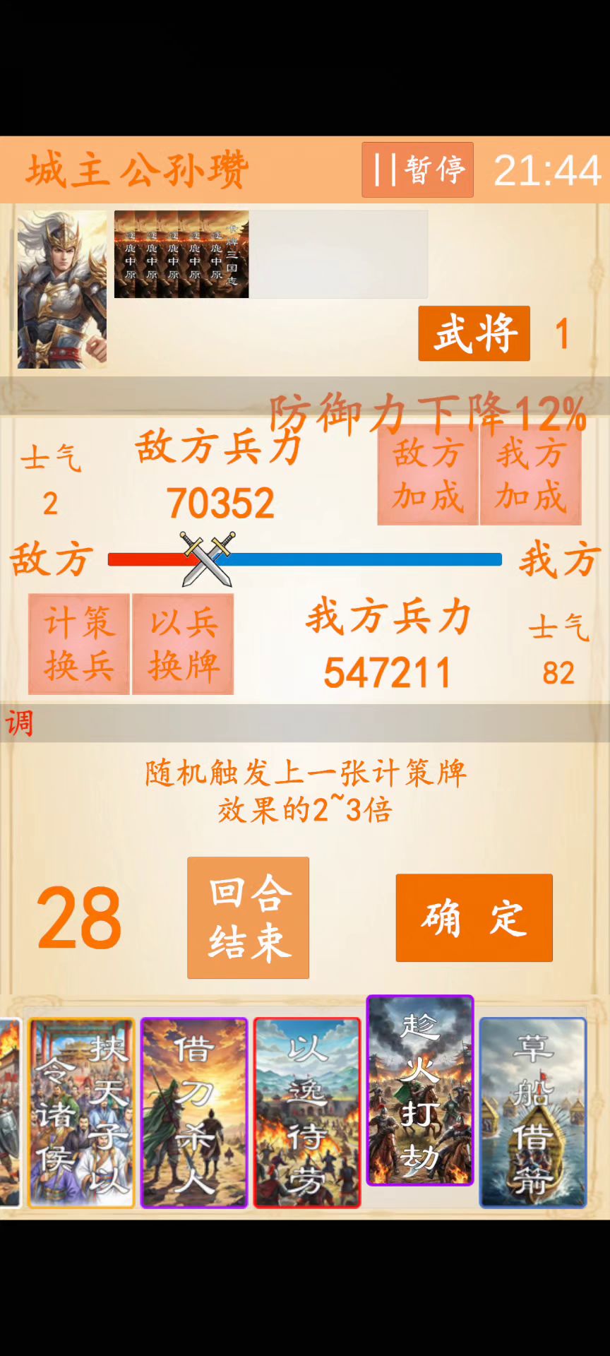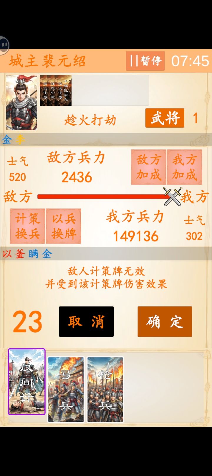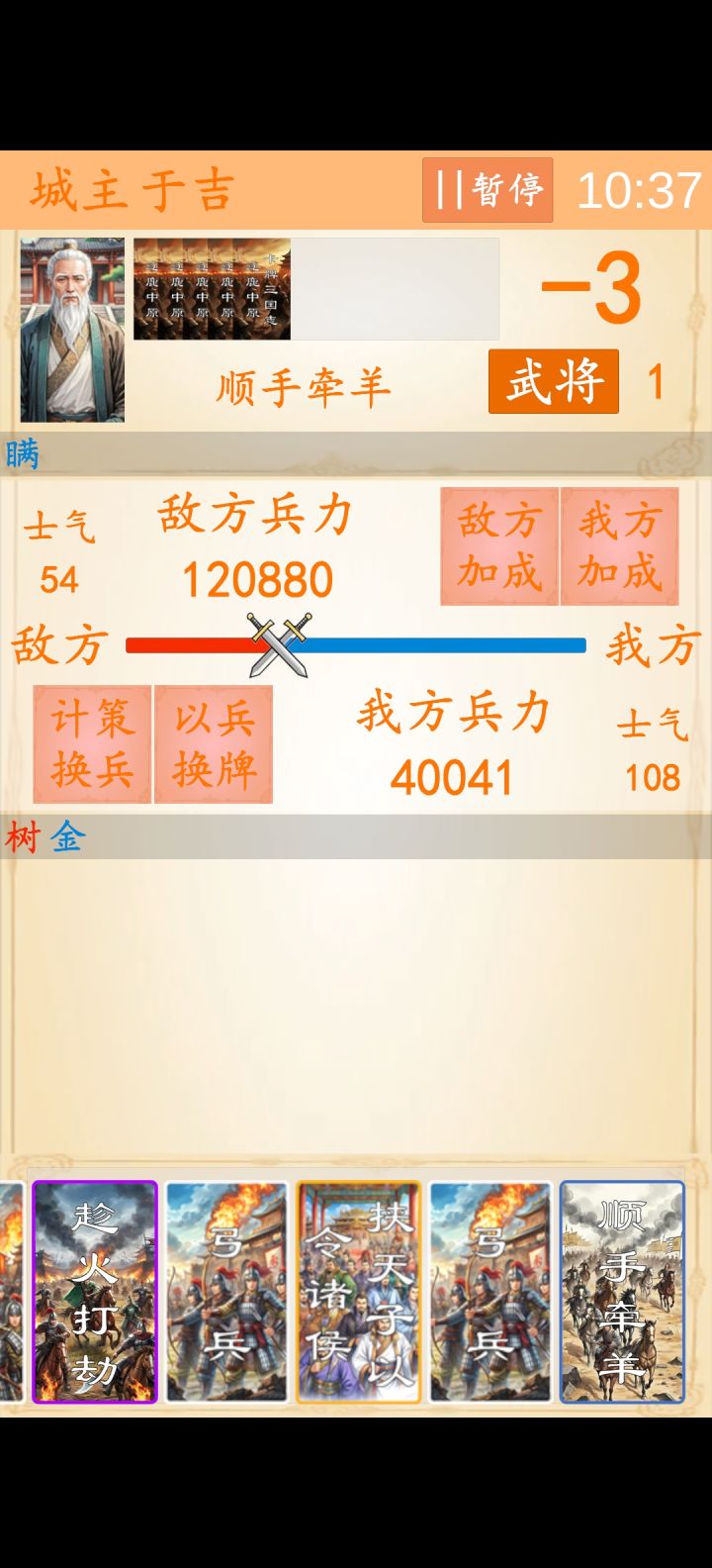 游戏为,征兵回合制卡牌类元宝用来转盘:铜钱用征兵研究所兵力起来了20万,之后再点进地图可选地图进行战斗,可以多点几次选兵力最少的时候战斗回合:首先我放回合牌分两种,计策牌(有颜色底面)和兵牌(白底面)我方回合出牌时,地方可以根据你出的牌打出牌来应对,我方同理:机制:出兵牌,对方也可以出兵牌,或计策免伤牌出计策牌时,只能出计策牌,增益buff类出不来回合结束:这个按钮会变成黑色,轮