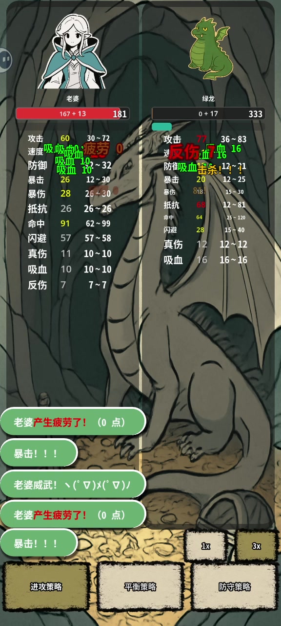 需要有不断的玩家测试出一些不平衡的地方,比如当前版本的疲劳是很厉害的debuff,这个debuff的目的是防止游戏进程卡住而快速让战斗白热化,但在当前版本疲劳与速度强绑定,削弱的速度的意义。这次实验的是最低防御加恢复手段过关,有点悬,因为在7/9,龙的恢复手段和防御和我方有一定对抗能力,导致我方在第二轮战斗疲劳能叠到90,但即使是这样,疲劳的强平衡还是让我方险胜,从这次游戏我们发现防御其实是恢复