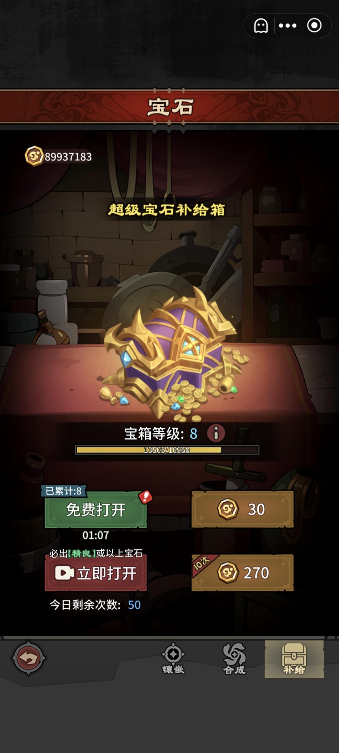 角色部分包含装备、等级、宝石等养成内容,装备和等级经验都是从关卡内获得,装备随机性较大。宝石每隔3分钟可以单抽一次,品级可以三个任意部位的合成晋级。镶嵌部位对宝石属性有固定要求,部分槽位需要看广告解锁。