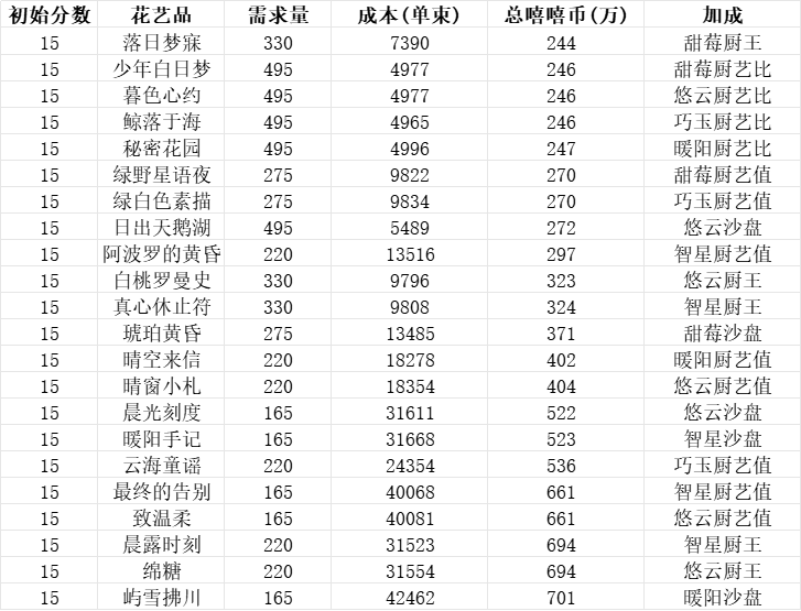 上次更新优化了藤蔓订单数量重新计算的结果 可以参考图2-图6* 表格按田产79朵计算 每个人可能有差别 44级后的花艺品还没解锁 所以无法计算本次更新内容体验1. 花艺品增加属性标识 选中能看具体加成 方便了很多 但存在标识显示不全 如图12. 零点不再自动刷新订单 这点明显弊大于利 怎么好意思叫优化 目前玩法的刷新方法: 1)会长副会删除 但要等两小时 2)自己花彩萝刷新#休闲游戏