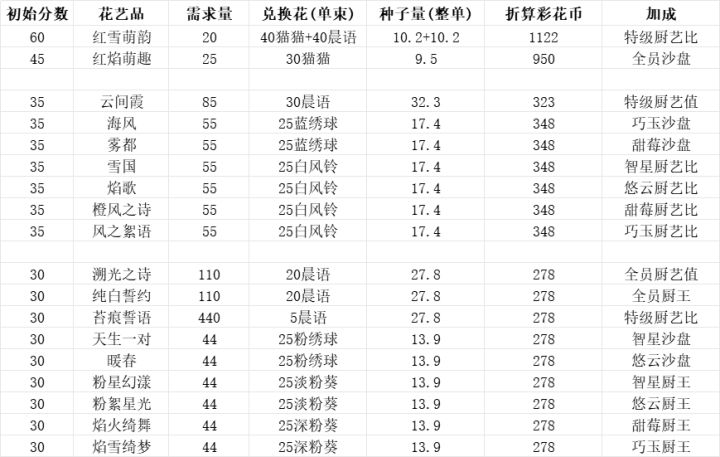 上次更新优化了藤蔓订单数量重新计算的结果 可以参考图2-图6* 表格按田产79朵计算 每个人可能有差别 44级后的花艺品还没解锁 所以无法计算本次更新内容体验1. 花艺品增加属性标识 选中能看具体加成 方便了很多 但存在标识显示不全 如图12. 零点不再自动刷新订单 这点明显弊大于利 怎么好意思叫优化 目前玩法的刷新方法: 1)会长副会删除 但要等两小时 2)自己花彩萝刷新#休闲游戏