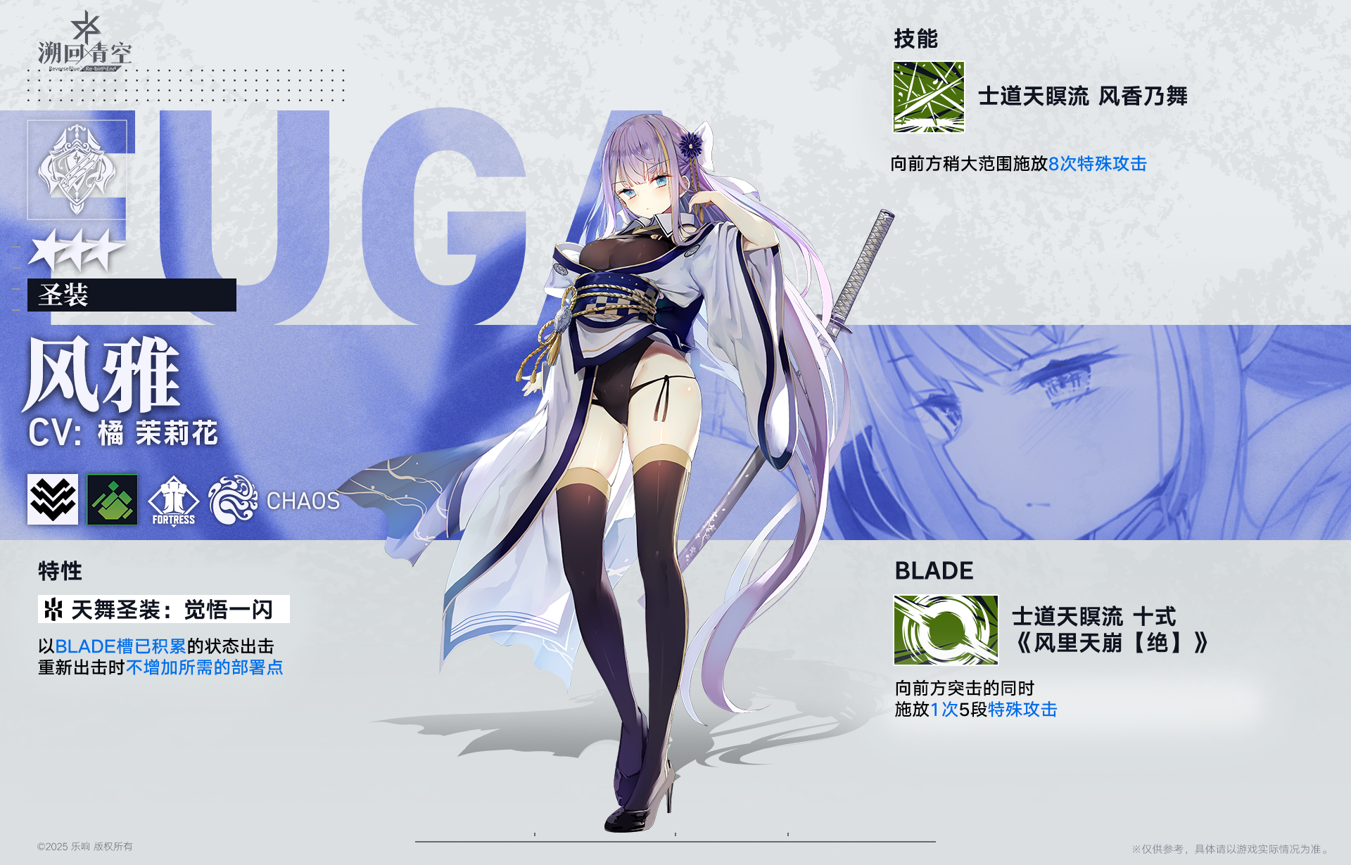 //风雅《圣装》 //cv: #橘茉莉花 ◆特性:【天舞圣装:觉悟一闪】 ◆技能:士道天瞑流 风香乃舞 ◆BLADE:士道天瞑流 十式 《风里天崩【绝】》 「陛下,庆典快乐。士道风雅,身着天舞圣装前来觐见 这圣装是士道的骄傲与勇气的体现,也是守护吾王与公主的觉悟象征」#溯回青空 #rxr
