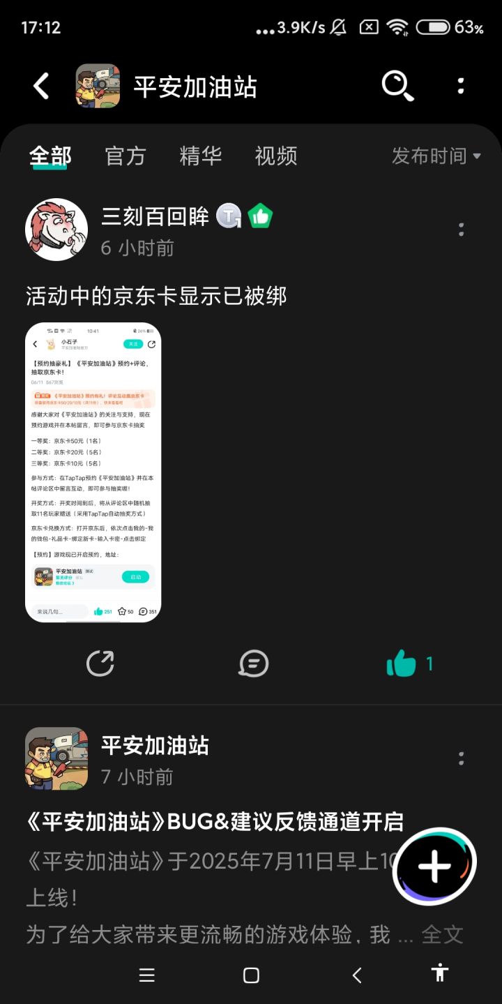 感谢大家对《平安加油站》的关注与支持,现在预约游戏并在本帖留言,即可参与京东卡抽奖一等奖:京东卡50元(1名)二等奖:京东卡20元(5名)三等奖:京东卡10元(5名)参与方式:在TapTap预约《平安加油站》并在本帖评论区中留言互动,即可参与抽奖喔!开奖方式:开奖时间到后,将从评论区中随机抽取11名玩家赠送(采用TapTap自动抽奖方式)京东卡兑换方式:打开京东后,依次点击我的-我的钱
