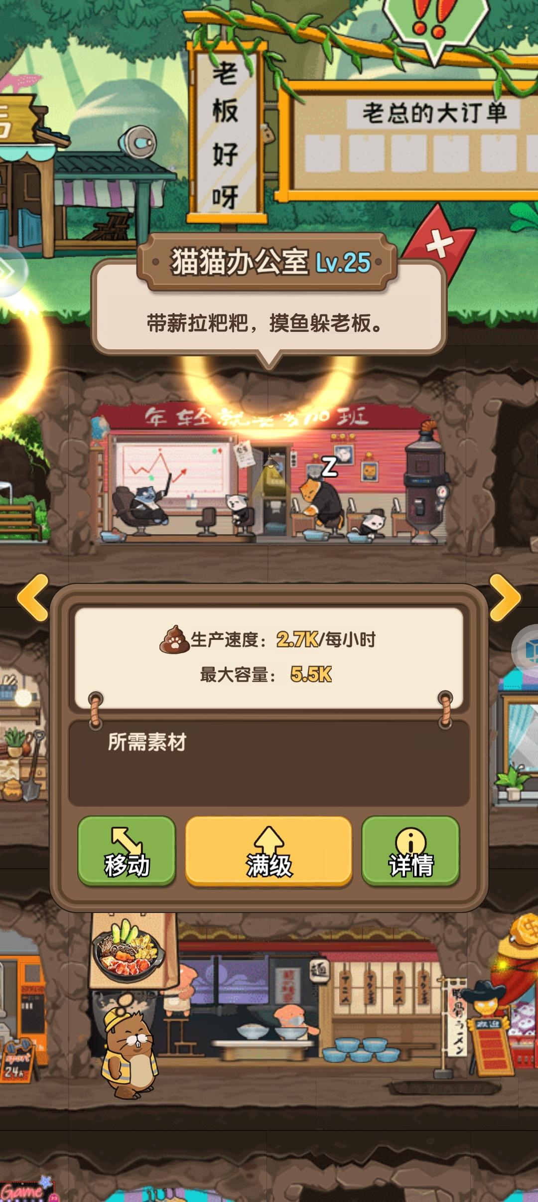 游戏主要玩法就是通过做订单赚钱然后建设自己的地鼠小镇,在这中间收集材料来养成角色通关各种副本,升级解锁更多场景。