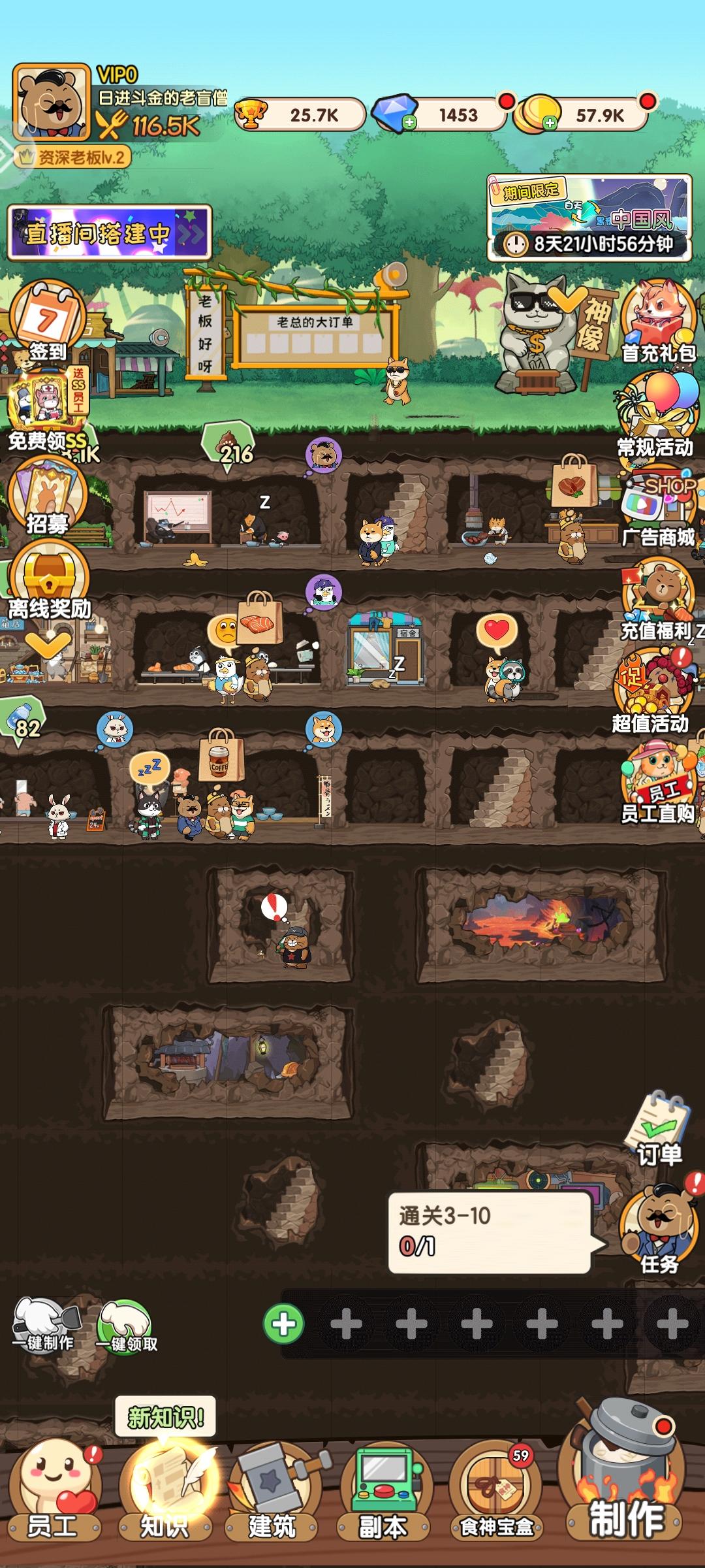 主推的做菜完成订单通过雷达抢别人的资源基本不缺,就是一个一个点到后面会很累。包括一键收菜不氪金是不给你用的,虽然一共就10几个建筑但会比较烦。