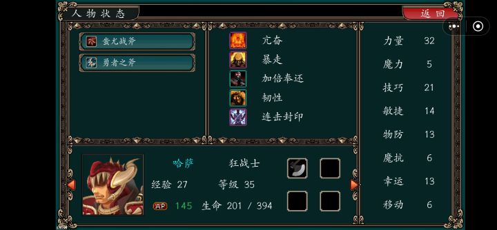 废了好大劲,把所有角色都练到了50级,最后没有吃种子通关了,吐槽一下,里奥最后还是噶了,冷板凳没人权啊顺便特别提名几个角色:亚度尼斯,所有人都在花钱,只有亚度尼斯在赚钱,打完之后一身乱七八糟的装备和灵药赛弗:能抗能奶能辅,有些时候比霍克都能抗村姑:相比原版获得了极大的加强,前期练级就靠她了,觉醒后免疫远程物理伤害,不仅每回合回血量大增,还能提供8点魔抗,最后一关站在赛弗后面,耶克萨武器全打