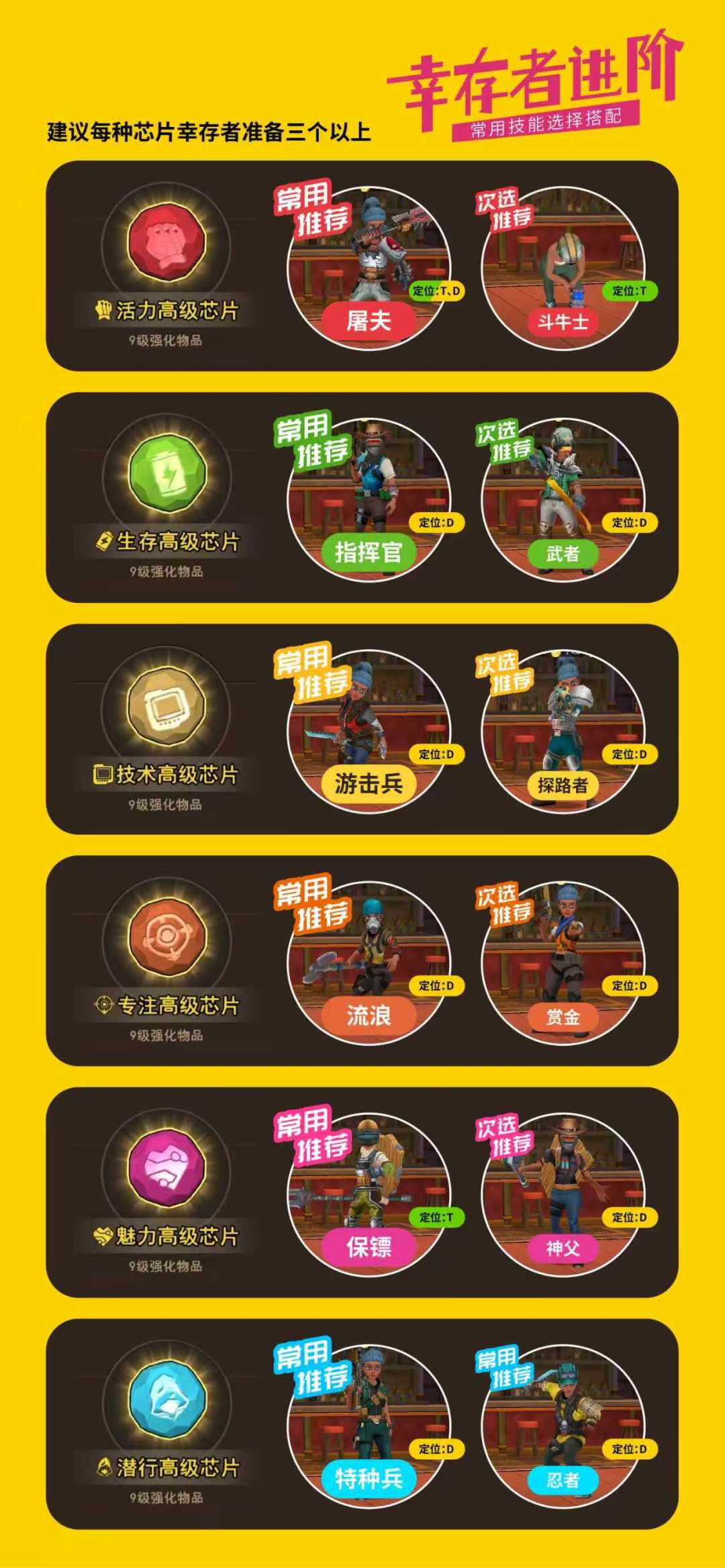 #攻略 爱新觉罗氏#01452 【幸存者攻略】经历长时间的游戏体验之后,发现大家最关系的无非就是围绕着幸存者怎么样更好,更强,更省心的话题去交谈,不同的搭配不同的效果,众说纷纭。 个人有些心得,可以聊聊看,供大家参考 首先是选择的问题,对于以后更好的应对各类型副本,每种芯片建议都需要常备三种以上的幸存者,多出来的部分按需分配 【主流部分】主要介绍5阶-6阶的幸存者 英雄是这个游戏最为核心的部分之