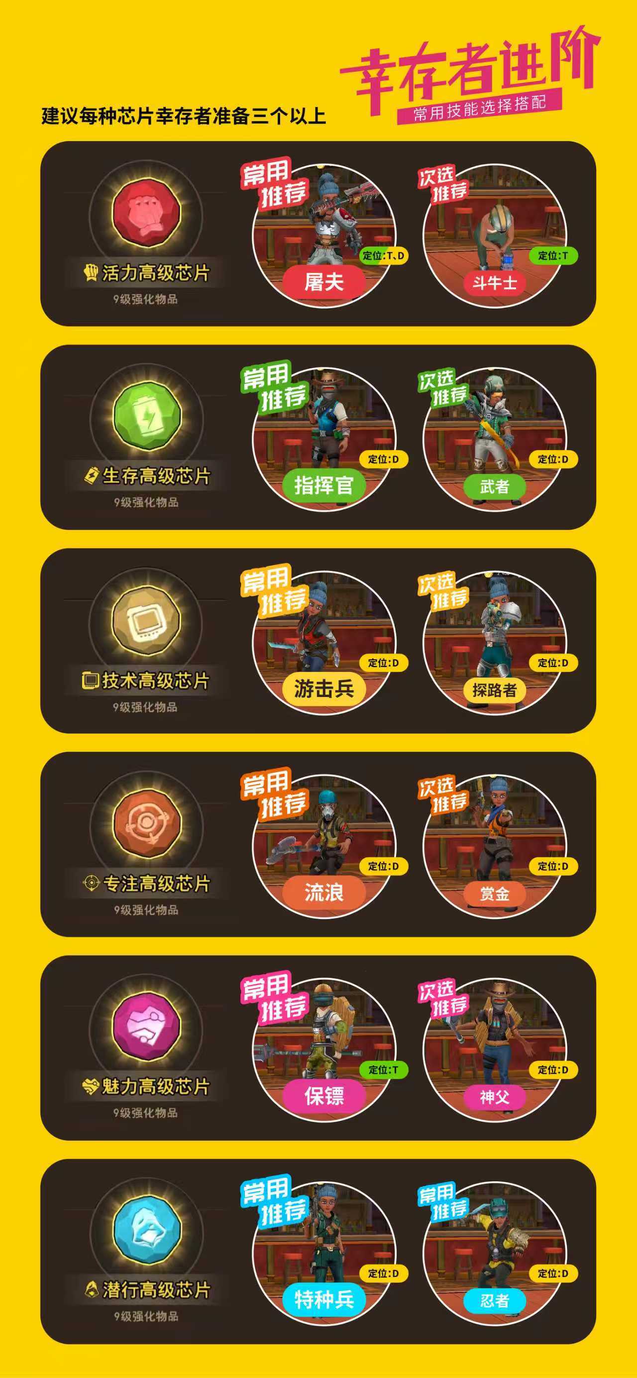 #攻略 爱新觉罗氏#01452【幸存者攻略】经历长时间的游戏体验之后,发现大家最关系的无非就是围绕着幸存者怎么样更好,更强,更省心的话题去交谈,不同的搭配不同的效果,众说纷纭。个人有些心得,可以聊聊看,供大家参考首先是选择的问题,对于以后更好的应对各类型副本,每种芯片建议都需要常备三种以上的幸存者,多出来的部分按需分配【主流部分】主要介绍5阶-6阶的幸存者英雄是这个游戏最为核心的部分之