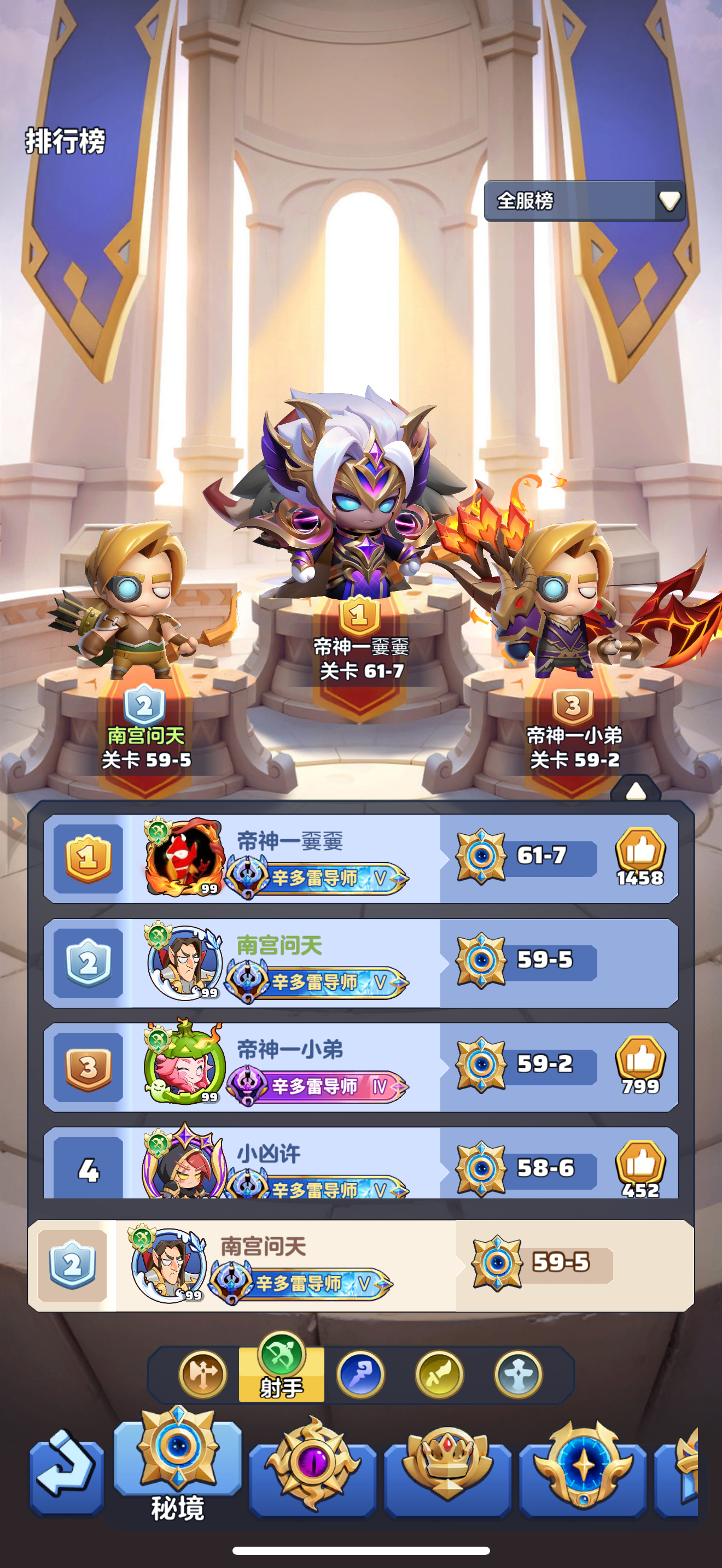 #勇者联盟 99级,战力11.8m,攻评411789,秘境59-6,本服排名第1,合服排名第2,又有人转射手来了,其实射手是个陷阱我已经看过无数刺客大佬转过来然后又转回去,只是再转回去爬塔会落后很多了