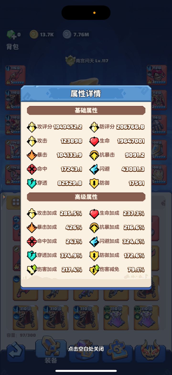 #勇者联盟 117级,战力28.2m,攻评104万,秘境92-3,本服排名第3,合服排名第6,难度967%,不知道零氪在119级能不能到1000%