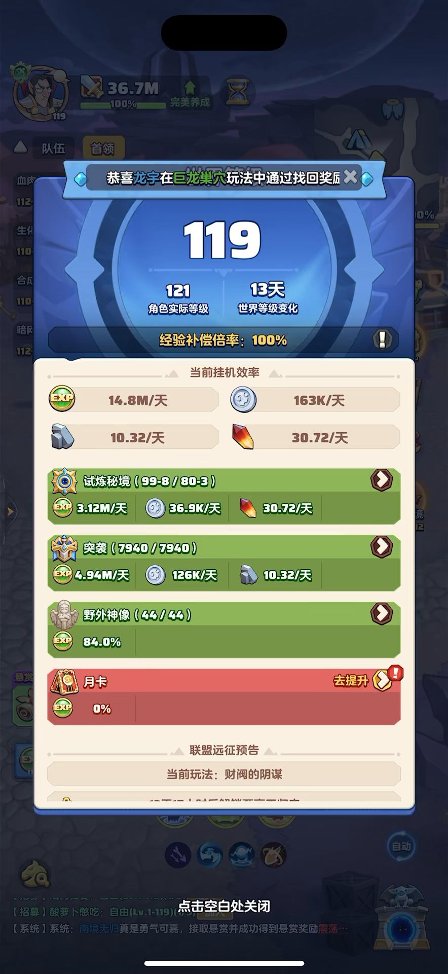 #勇者联盟 119级,战力36.7m,攻评129万,秘境99-5,本服排名第2,合服排名第7,神谕重开,宠物染色消失