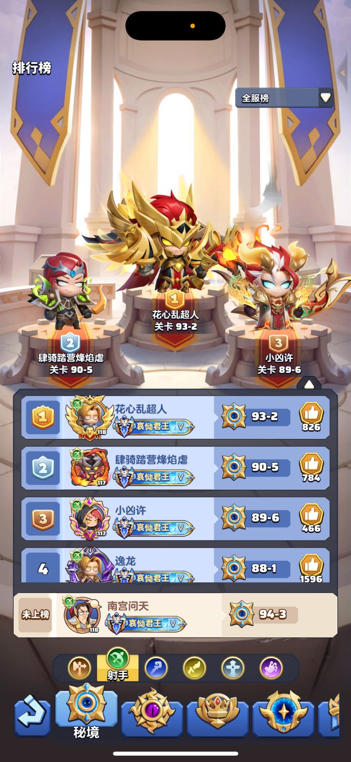 #勇者联盟 118级,战力31.2m,攻评112万,秘境94-3,刺客本服排名第3,合服排名第8,今天终于转回射手!