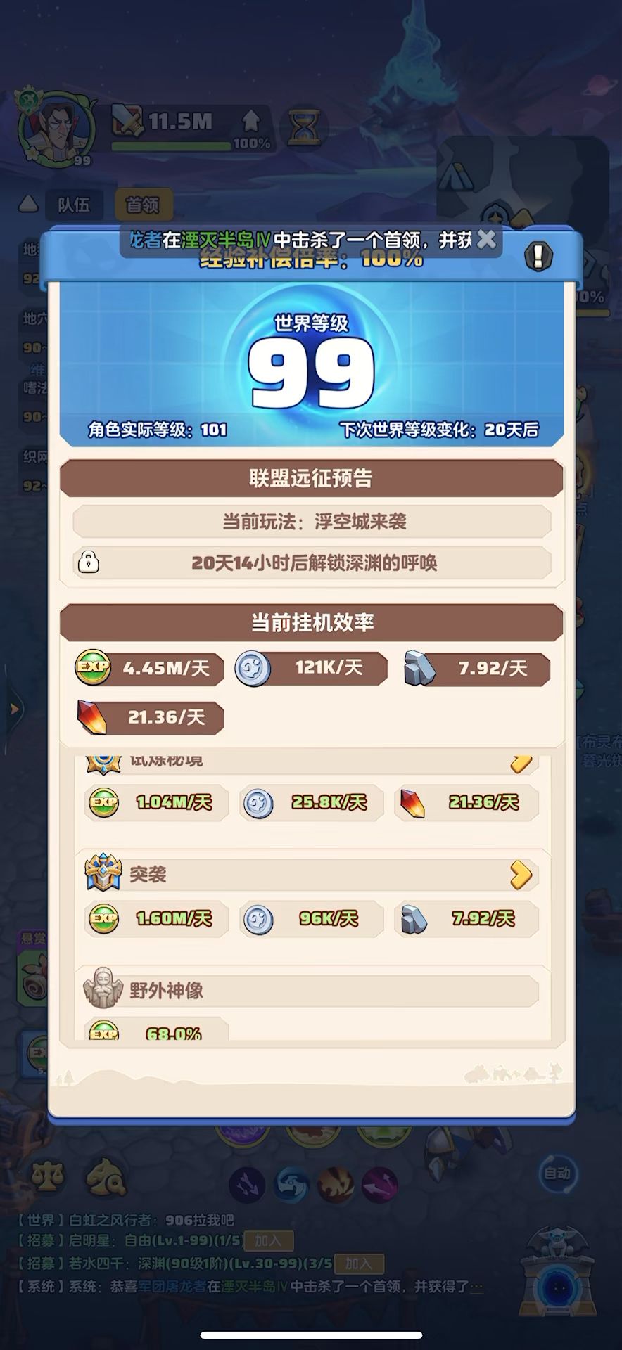 #勇者联盟 99级,战力11.5m,攻评406240,秘境57-2,本服排名第1,合服排名第5,今天神谕全开了