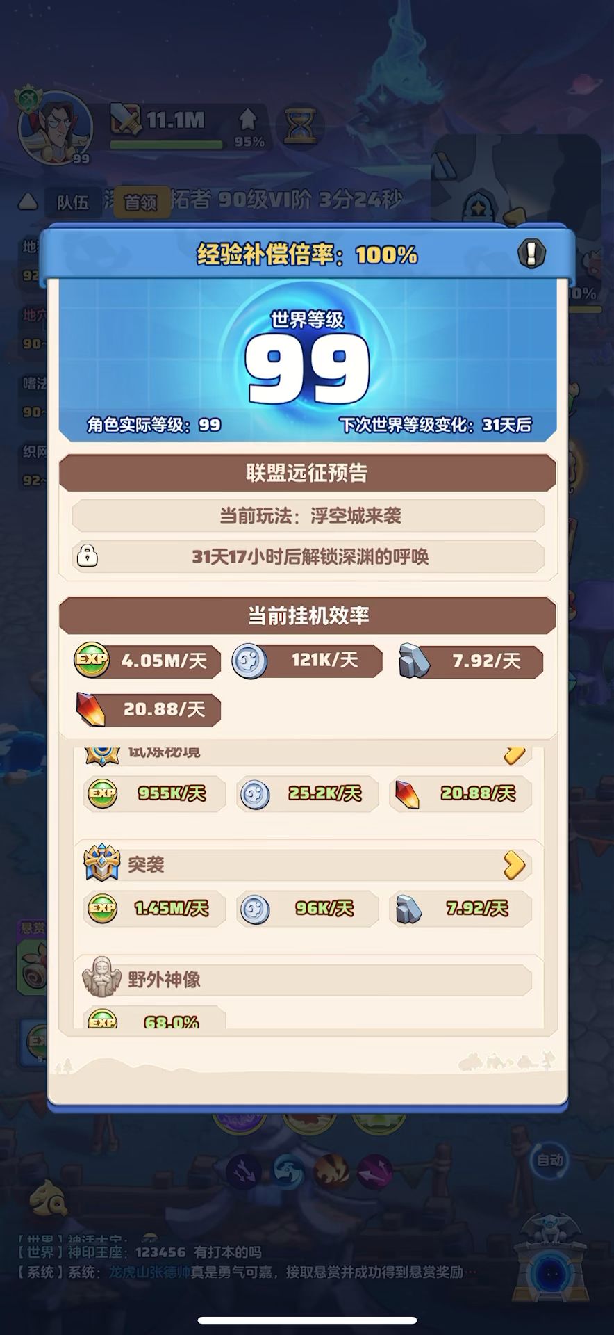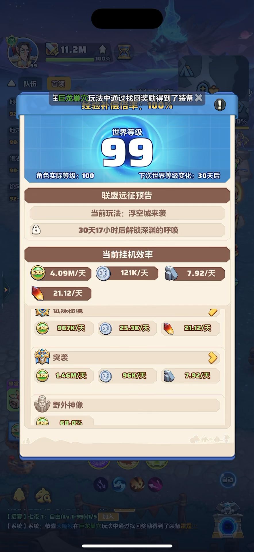 #勇者联盟 99级,战力11.2m,攻评384908,秘境54-5,本服排名第1,合服排名第1