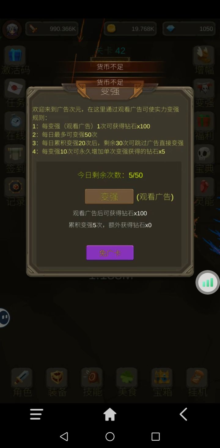 广告变现,每日看50个广告获得钻石资源,或者其他增幅强化。装备、技能、美食都要抽,钻石需求量巨大,付费深度坑比较深。有免广告,但是否有诚意有待商榷。