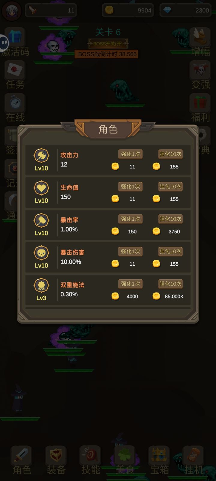 主角的养成是消耗金币资源强化基础战斗属性,支持一次10级,这在很多轻度放置类游戏都很常见,需求量数值跳变较大,以此来增加游戏时长。