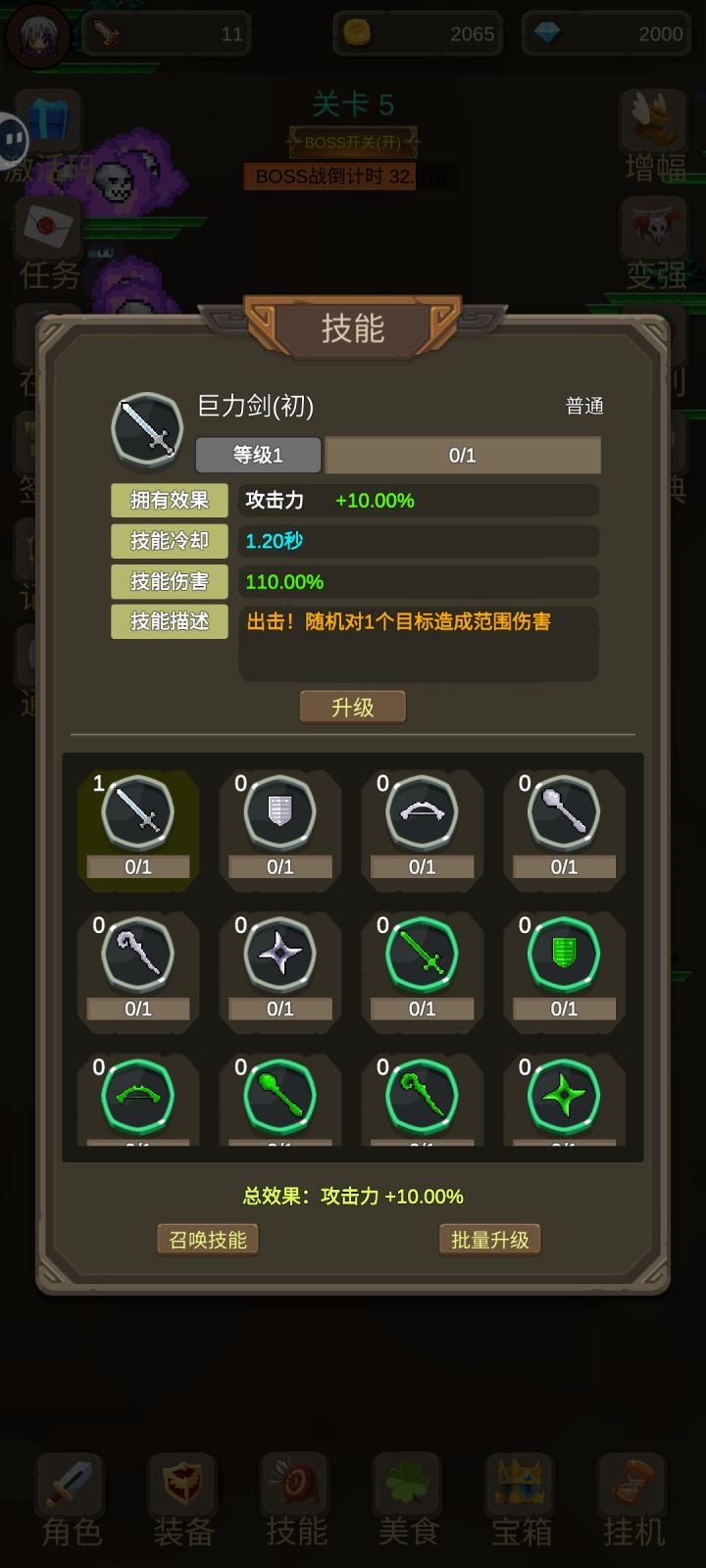 技能和美食其实和装备都是同一种养成形式,类似咸鱼的养成设定,支持30连抽和一键批量强化升级,养成的数值深度可见一斑。