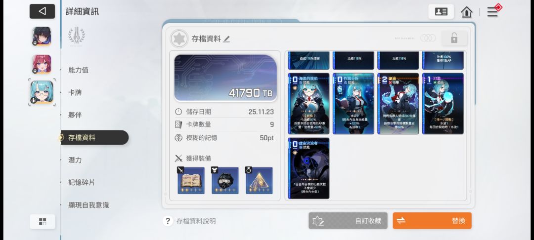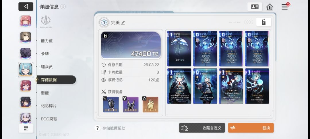 第一个号因为弯路走的比较多,在体验了大部分的游戏内容后。想试试能不能用纯四星阵容开荒,于是直接重置账号转生。 先贴一下这个号box: 开荒到今天是第十一天,整体感觉很平滑,重点造价极低且几乎无门槛。 进度的话,两个深渊全满星(几乎没凹,一遍过)。零号图3难十84级。图四图五难6,还没开始肝。好了废话不多说,直接说配队。 第一队:奶刀队(德蕾莎+米卡+雷伊) 优点:稳定启动,不吃费,存档要求
