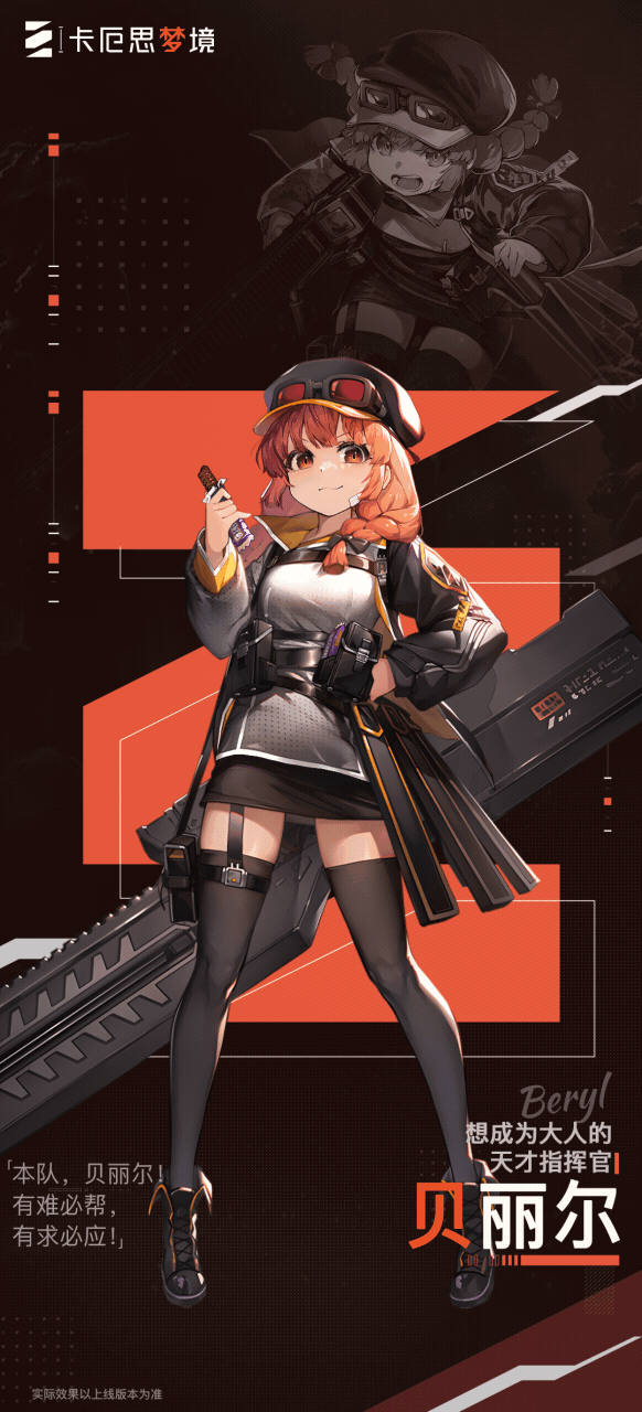 贝丽尔 | 想成为大人的天才指挥官「本队,贝丽尔!有难必帮,有求必应!」〓战员档案〓◆种族:人类◆生日:10月24日◆属性:正义◆职业:游侠◆异能:怪力◆所属势力:猎狼行进队从传奇军人的奶奶那里继承了卓越的战略战术和敏锐的判断力,年纪轻轻就成为了猎狼行进队的小队长。为了成为“值得信赖的队长”,而不断努力。然而,她喜欢巧克力棒,或者在遇到困难时想用武力解决问题等孩子气的一面,很难完