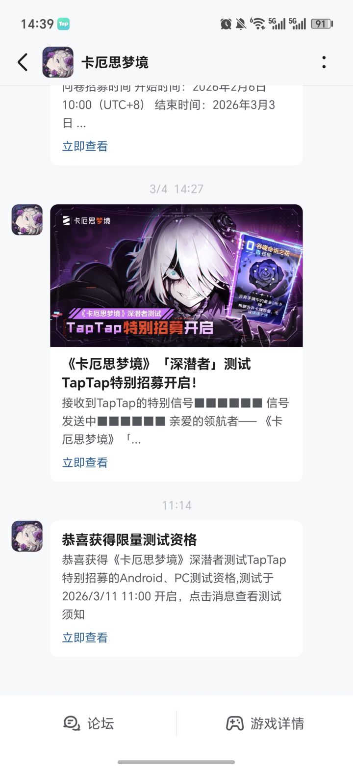 亲爱的领航者,「深潜者」测试资格正陆续发放中!我们将通过平台站内信以及您在招募问卷中填写的手机短信通知获得资格的领航者。您也可以前往《卡厄思梦境》游戏官网,登录您在问卷中填写的账号,点击首页“查询”按钮,查看自己是否获得测试资格。本次「深潜者」测试预下载将于3月10日 11:00(UTC+8)开启,届时将会给获得资格的领航者通过站内信、短信、群公告的方式发放指引及下载链接。「深潜者」测试的开