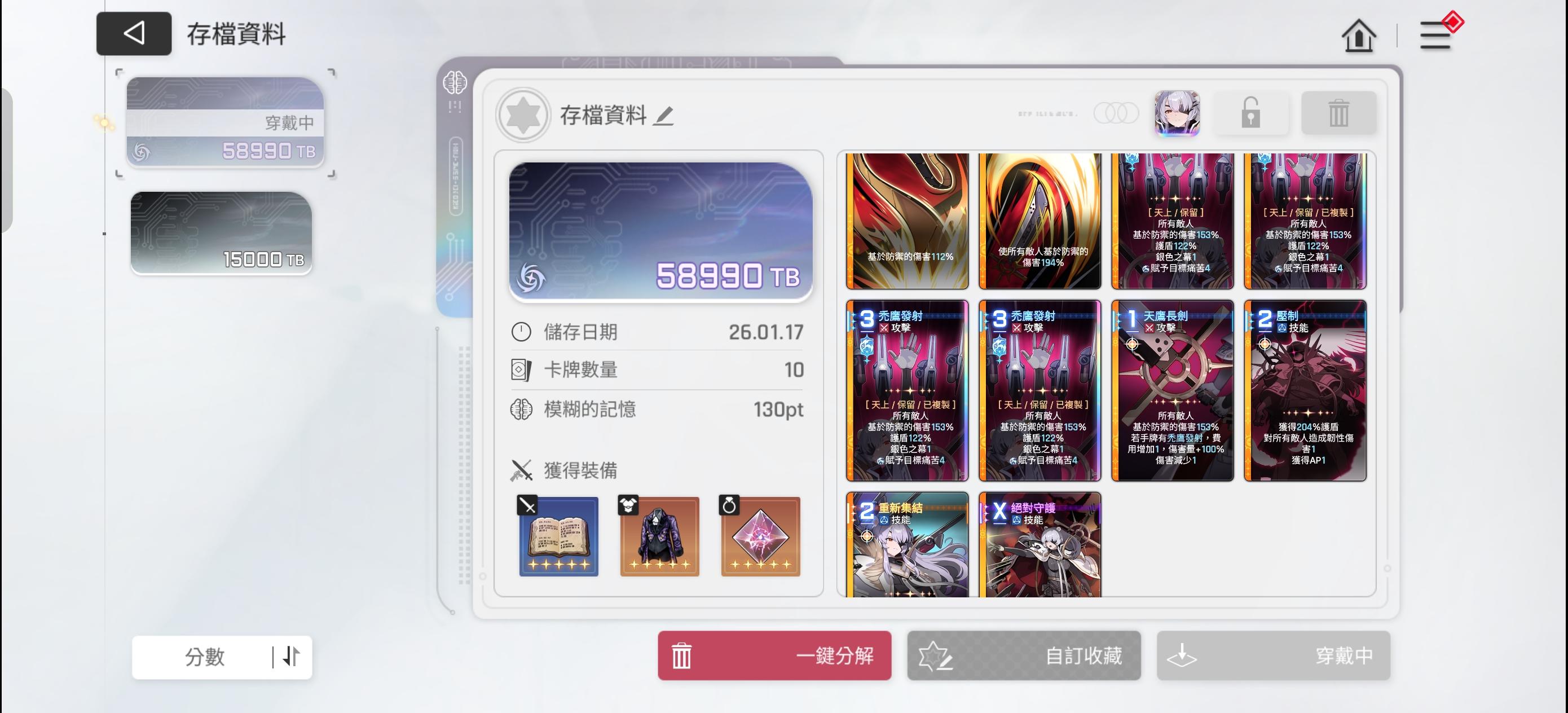 图片1:卡组核心,复制两张提高入手率即可(初次复制0pt),该卡回合可以多次使用叠加,2张卡的情况下配合过牌队友可以做到全场战斗稳定覆盖图片2:核心功能辅助卡,仅搭配破韧角色(天使)时利用率和功能性最大,可以复制2张(二次复制10pt),提高入手率和使用率即可,多张同类卡牌会影响卡组库存占用,并占据手牌上限图片3:条件限定卡,仅破防后,怪物有对应弱点或者被挂弱点状态可触发,搭配天使的电浆飞弹普