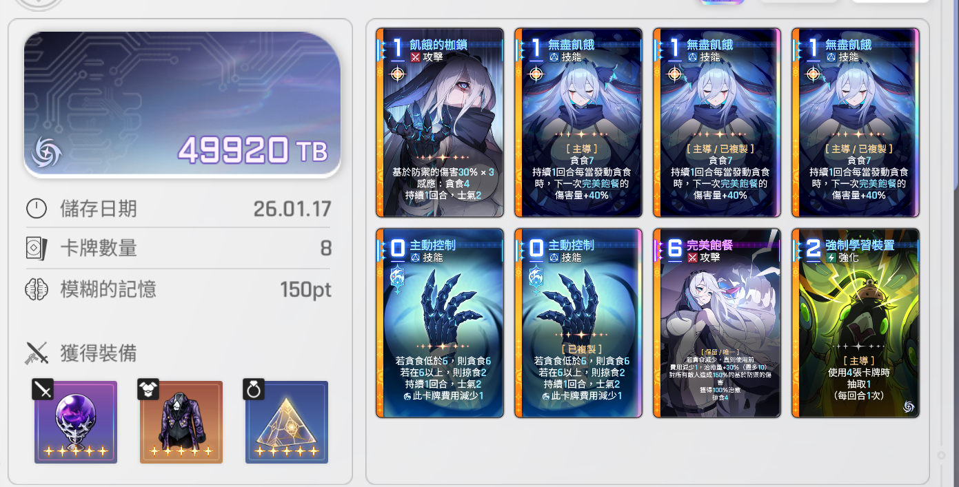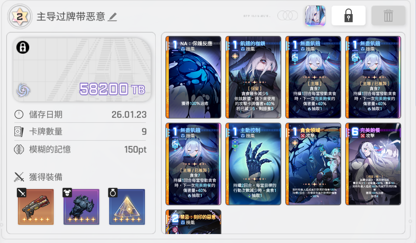 图片1:卡组核心,复制两张提高入手率即可(初次复制0pt),该卡回合可以多次使用叠加,2张卡的情况下配合过牌队友可以做到全场战斗稳定覆盖图片2:核心功能辅助卡,仅搭配破韧角色(天使)时利用率和功能性最大,可以复制2张(二次复制10pt),提高入手率和使用率即可,多张同类卡牌会影响卡组库存占用,并占据手牌上限图片3:条件限定卡,仅破防后,怪物有对应弱点或者被挂弱点状态可触发,搭配天使的电浆飞弹普