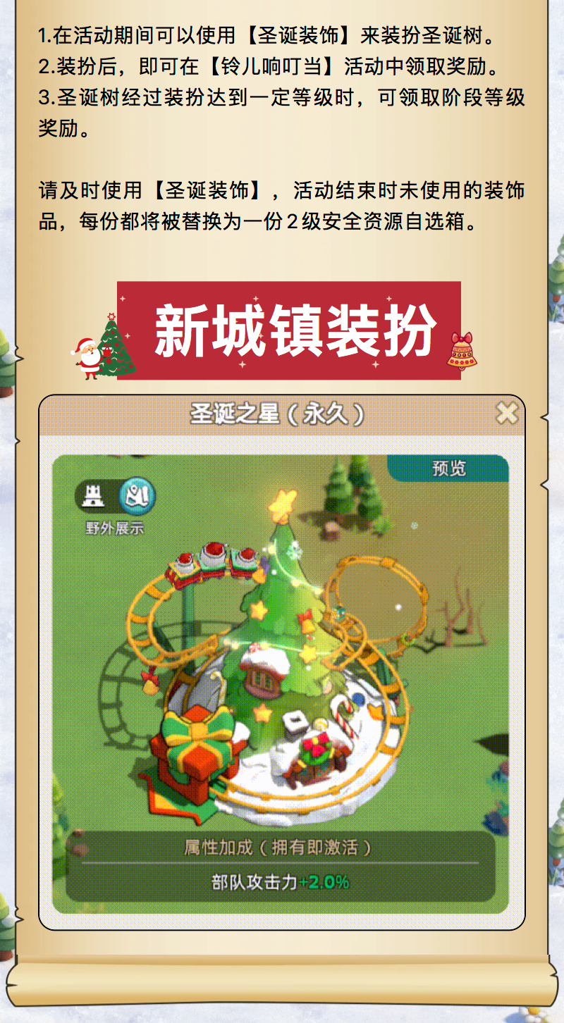 亲爱的领主:一年一度的圣诞庆典即将开启,快来一起看看有哪些精彩活动吧!*圣诞庆典将于2025/12/23 00:00:00~2025/12/29 23:59:59北京时间(部分活动将持续至2025/12/30 23:59:59北京时间)于符合条件的王国开放,更多内容详见游戏内活动规则。*圣诞庆典活动开启需城镇中心达到6级。*圣诞进行曲将于2025/12/24 00:00:00~2025/1