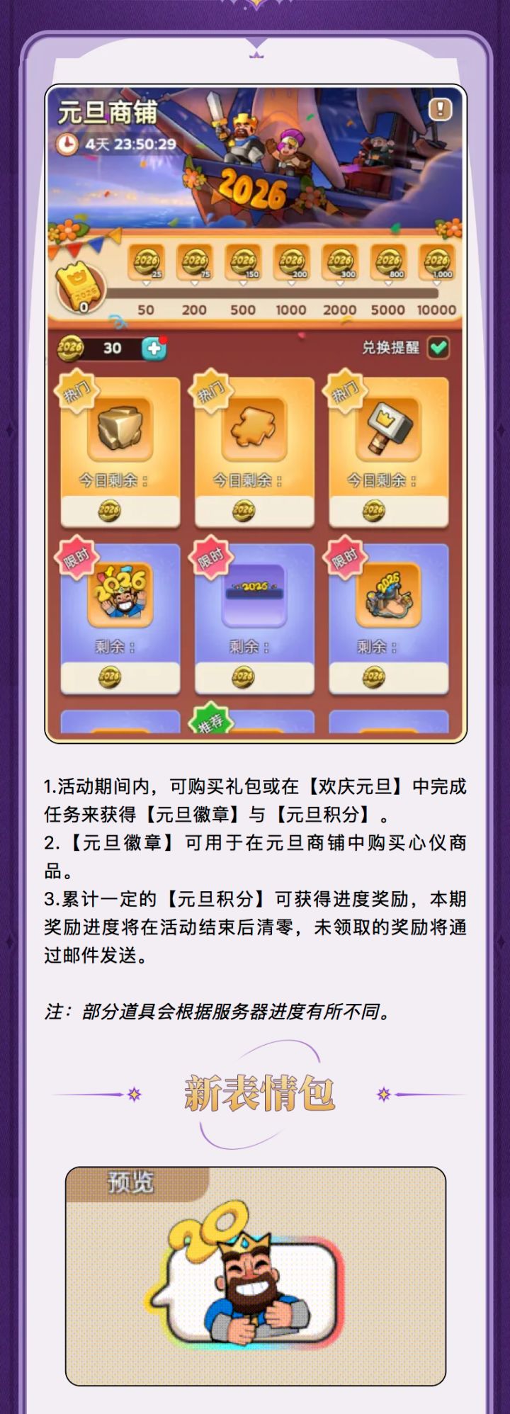 亲爱的领主:岁序更迭,万象焕新。未来的序幕正悄然拉开,愿你我执笔书写各自的星辰与远方。活动时间:2025年12月31日 00:00:00至2026年1月4日 23:59:59(北京时间)杰贝尔这里给看完的领主送给小兑换码,元旦当天还有节日兑换码哦~🔑 兑换码:BBWG1230⏰ 有效期至:2026年1月1日 23:59:59✨ 兑换要求:城镇中心等级 ≥ 9级注:部分活动和功能首