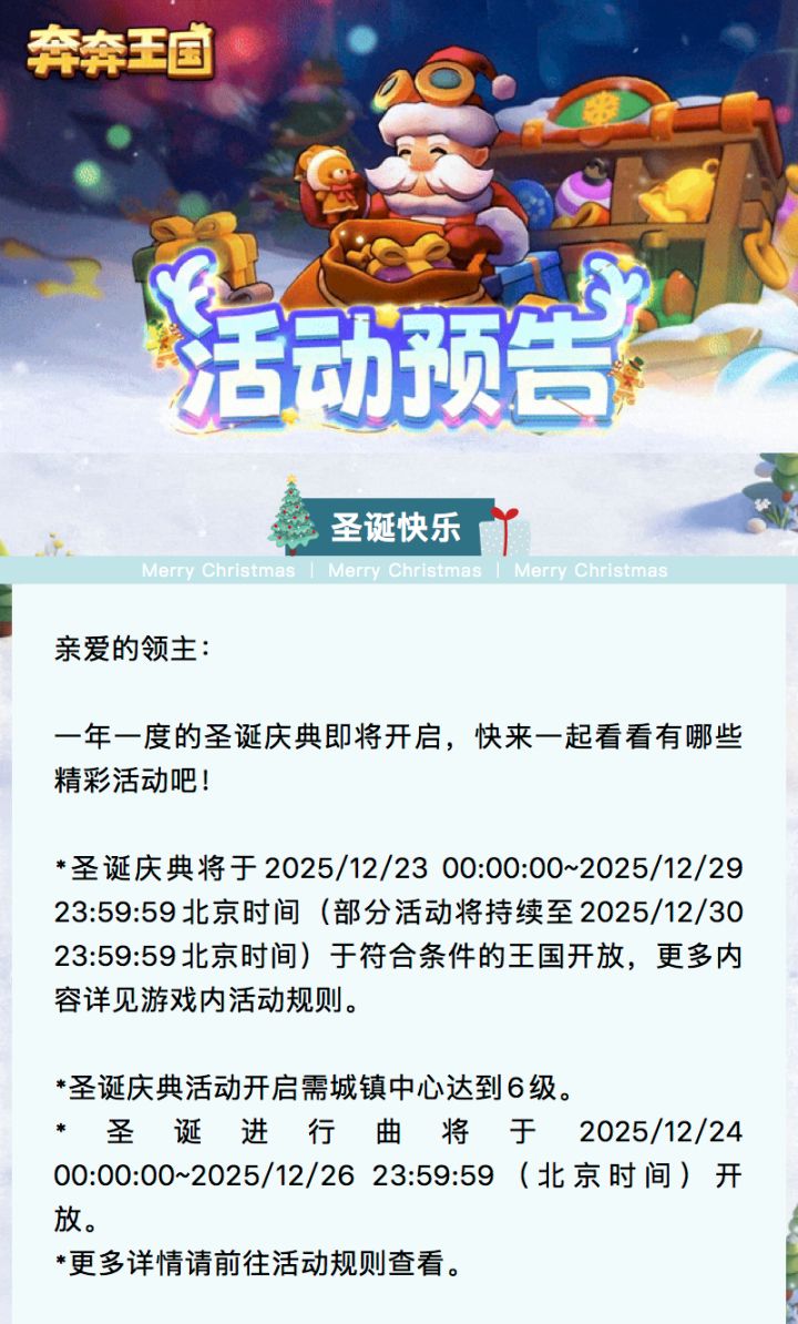 亲爱的领主:一年一度的圣诞庆典即将开启,快来一起看看有哪些精彩活动吧!*圣诞庆典将于2025/12/23 00:00:00~2025/12/29 23:59:59北京时间(部分活动将持续至2025/12/30 23:59:59北京时间)于符合条件的王国开放,更多内容详见游戏内活动规则。*圣诞庆典活动开启需城镇中心达到6级。*圣诞进行曲将于2025/12/24 00:00:00~2025/1
